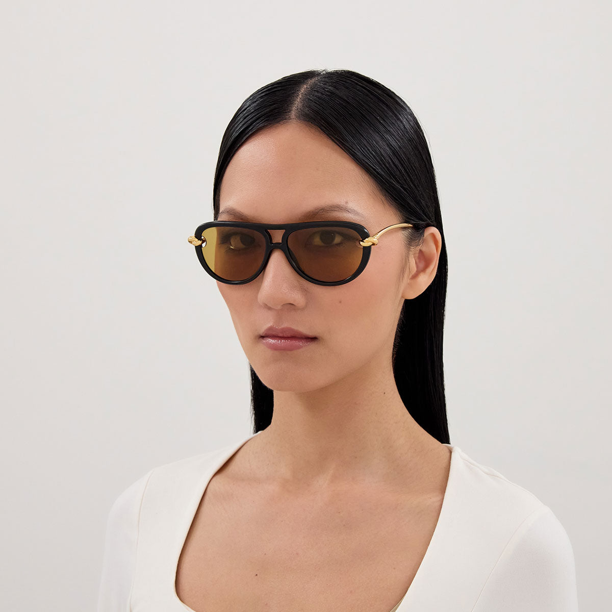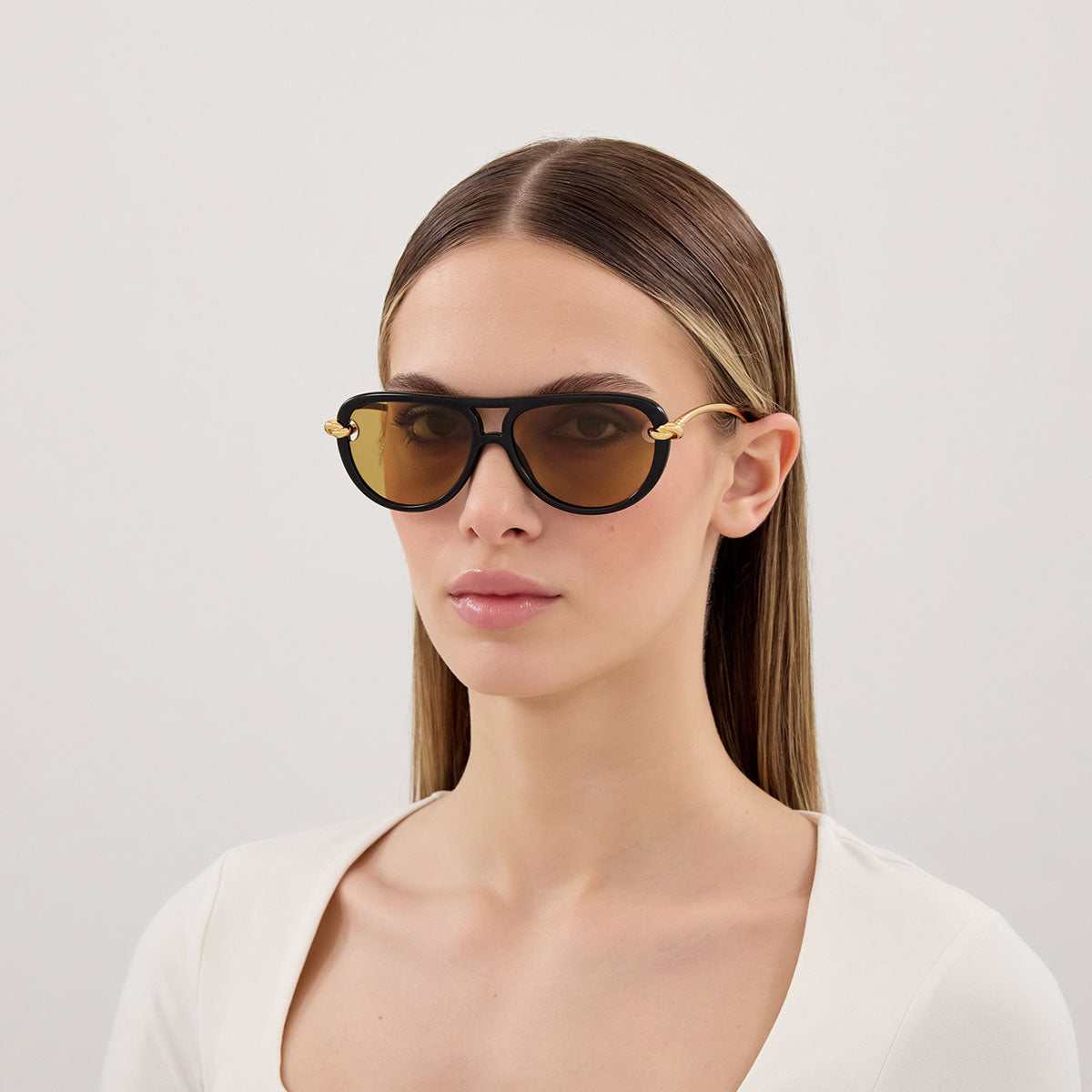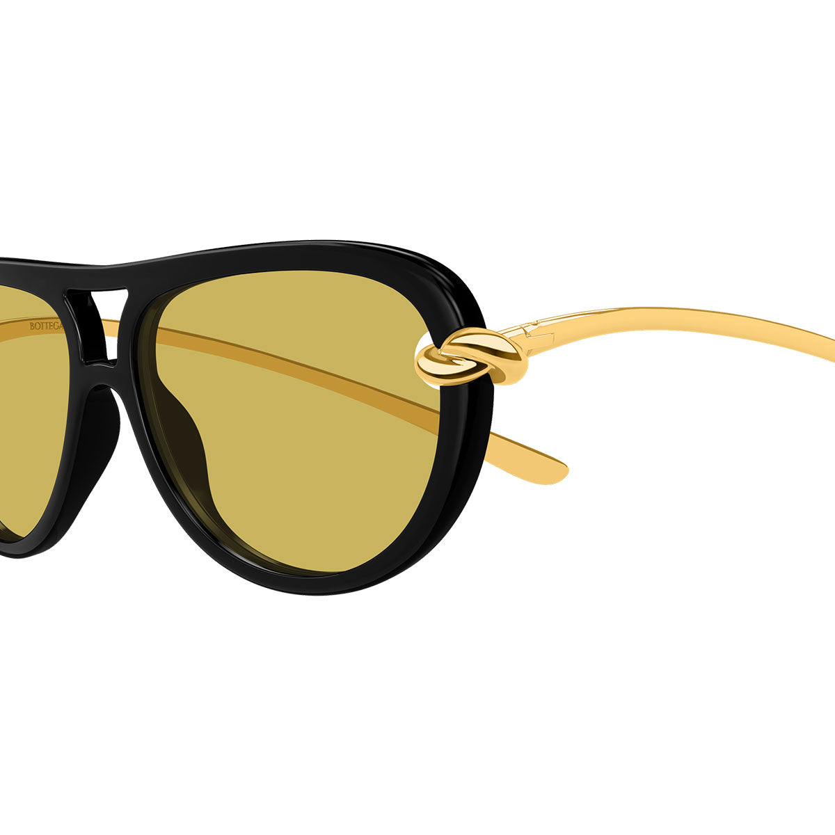 Dal fascino retrò e dall’eleganza moderna nascono gli occhiali da sole Bottega Veneta BV1418S. Caratterizzati da una forma aviatore di ispirazione vintage, si distinguono per i bordi smussati che conferiscono raffinatezza e profondità al design. Un dettaglio unico è rappresentato dal nodo avvolgente su ciascun musetto, simbolo distintivo dell'artigianalità del brand. I terminali organici sono finemente rifiniti con il logo Bottega Veneta inciso al laser, per un tocco di discreta esclusività. Un modello pensato per chi ama lo stile iconico e senza tempo.