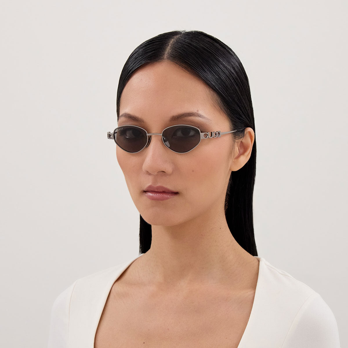 Occhiali da sole dal forte appeal fashion, realizzati interamente in metallo innovativo e leggero, per un look audace e contemporaneo. La montatura presenta una forma geometrica ovale e uno stile maschile, valorizzato da una finitura galvanica di alta qualità. Il design è reso unico dal logo con scritta tridimensionale e ricurva, visibile da entrambi i lati, che in alcune SKU è impreziosito da strass. Le lenti, disponibili sia tinta unita che specchiate, completano un modello pensato per chi desidera unire stile, innovazione e personalità firmata Gucci.