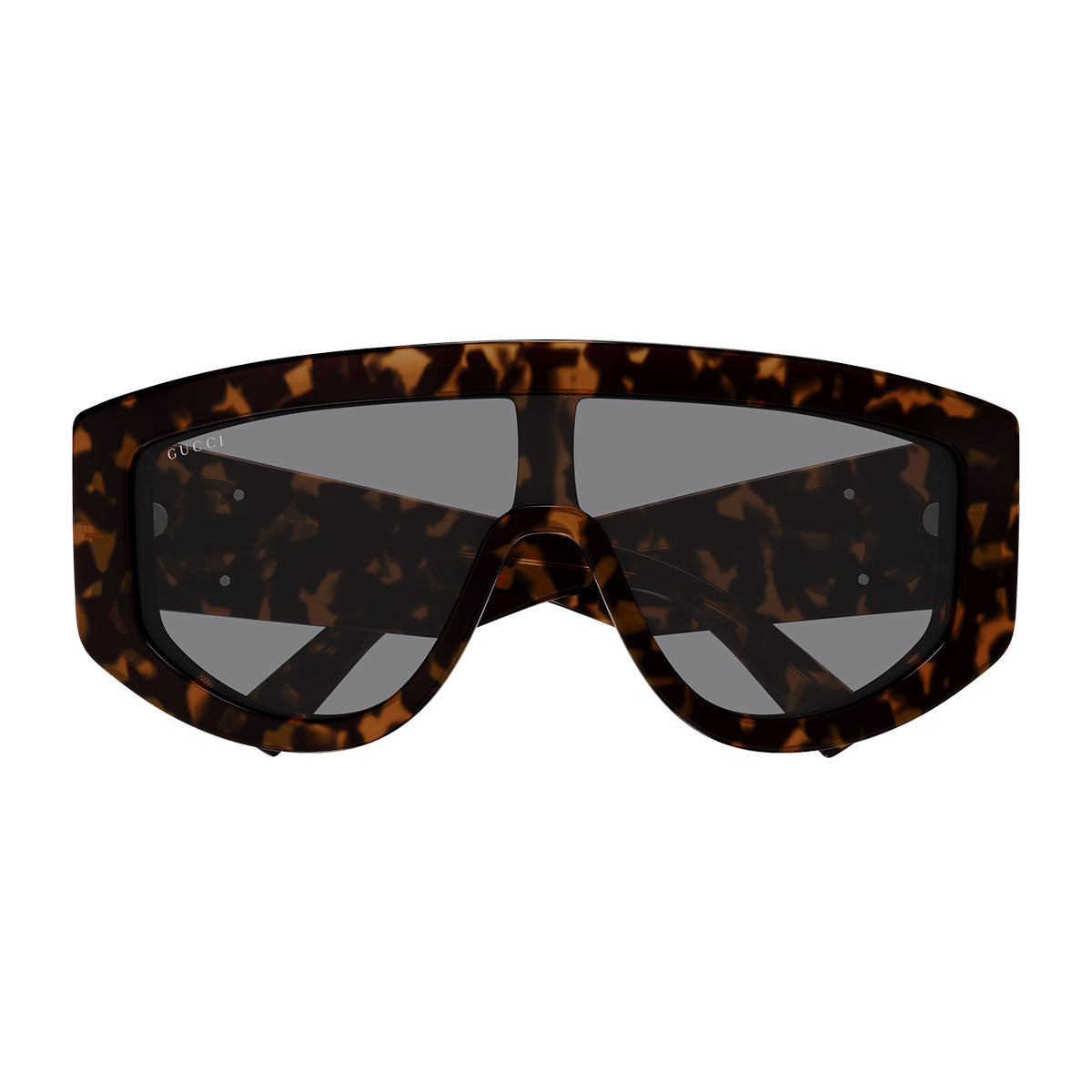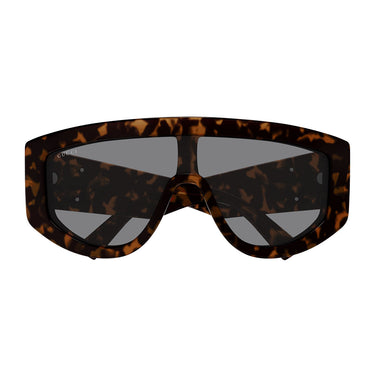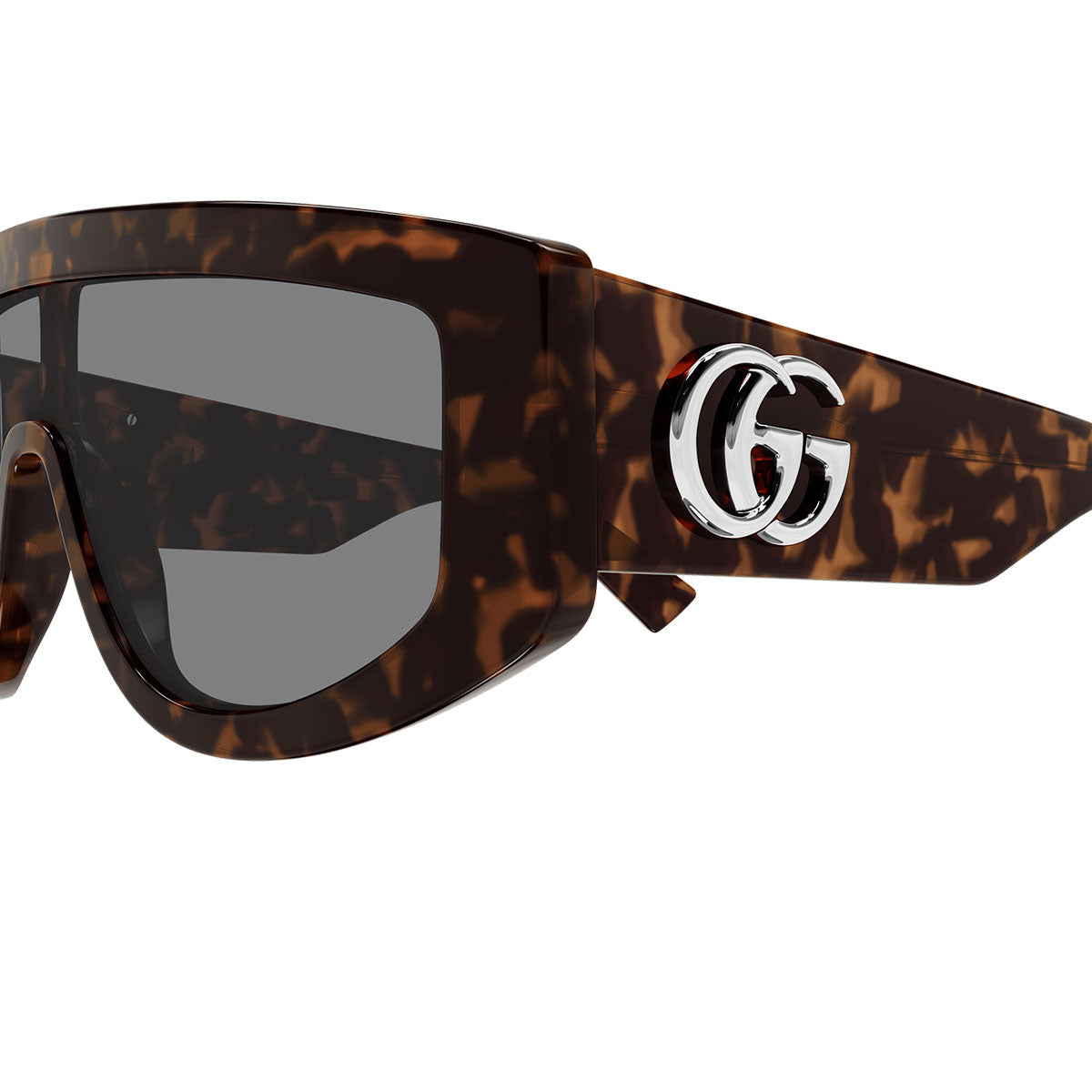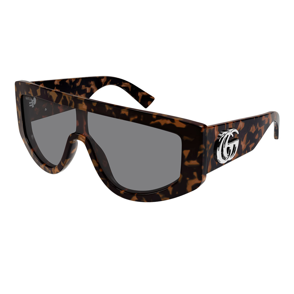 Occhiali da sole dal design audace e contemporaneo, caratterizzati da una maschera monolente in acetato di spessore. Le aste spesse sono impreziosite dal logo Double G tridimensionale con finitura galvanica color argento, simbolo distintivo dell’estetica Gucci. La palette cromatica è pensata per un appeal commerciale, con tonalità scure e una variante in elegante avorio. Un accessorio iconico che unisce stile e personalità.