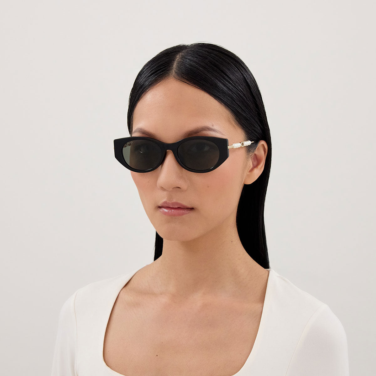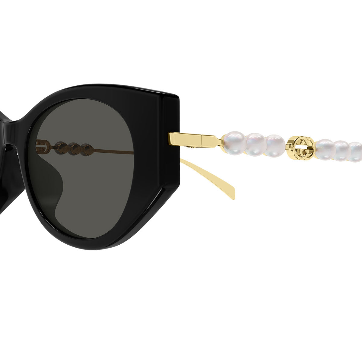 Le aste sono decorate con sei perle o dettagli in strass su ciascun lato, a seconda della SKU, offrendo un tocco prezioso e distintivo. Il tutto è completato dall’iconico logo Interlocking G, simbolo della tradizione Gucci, posizionato con discrezione ed eleganza.