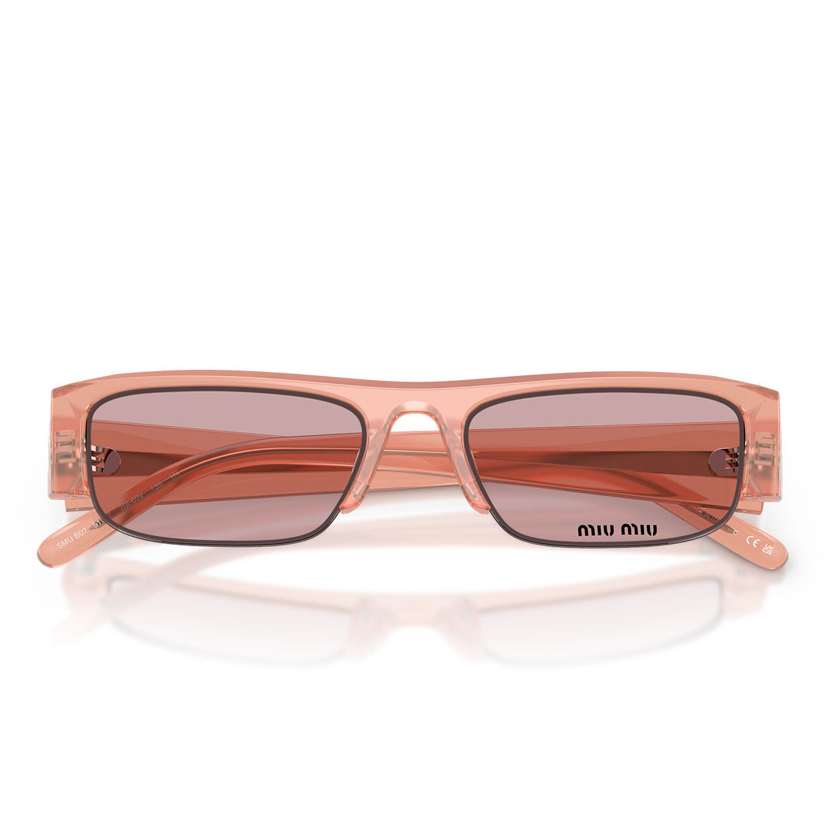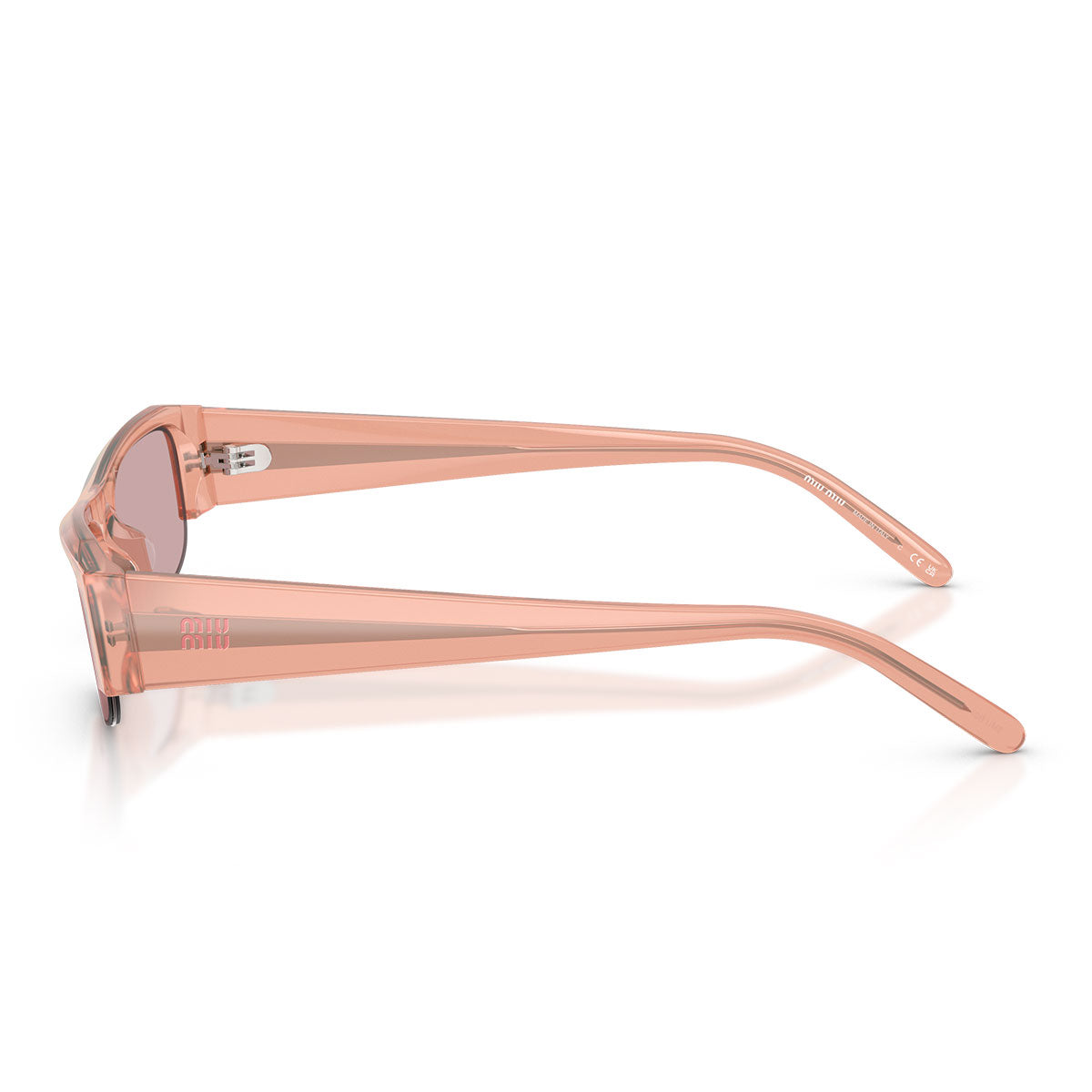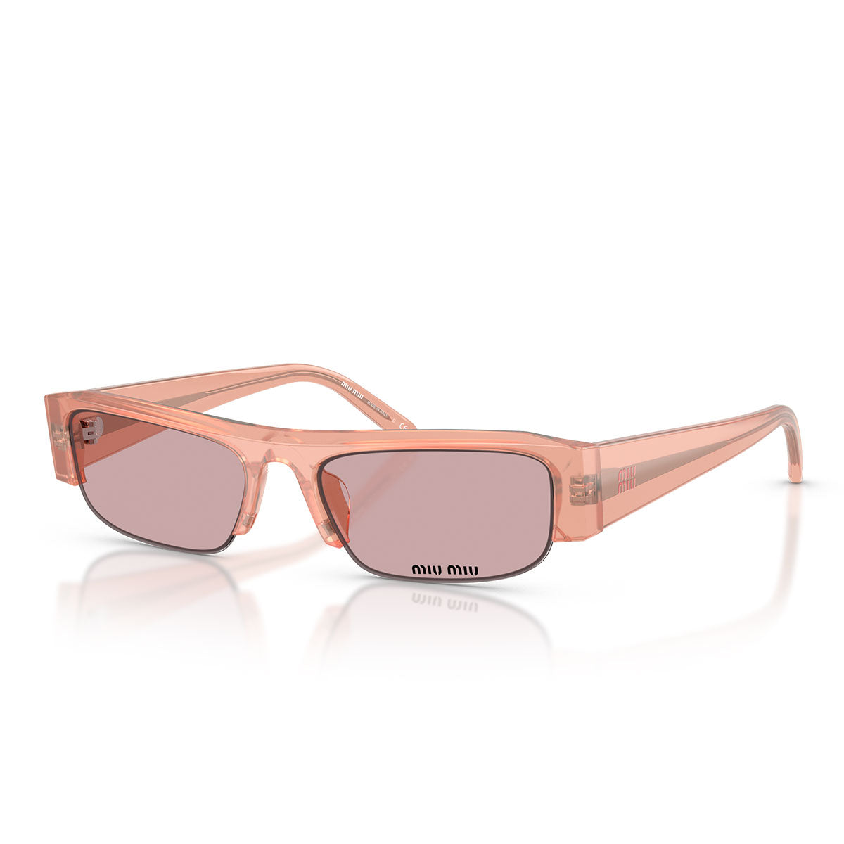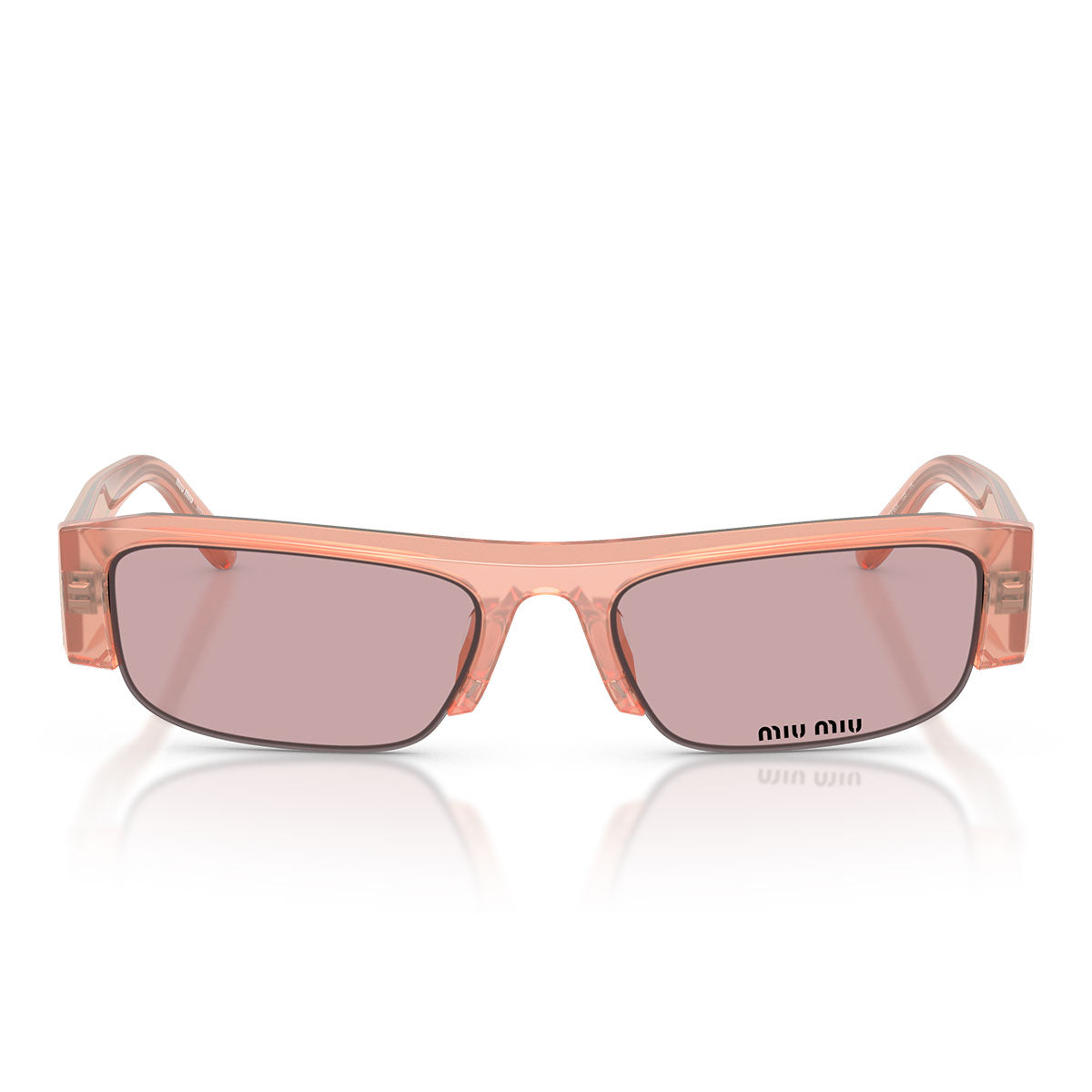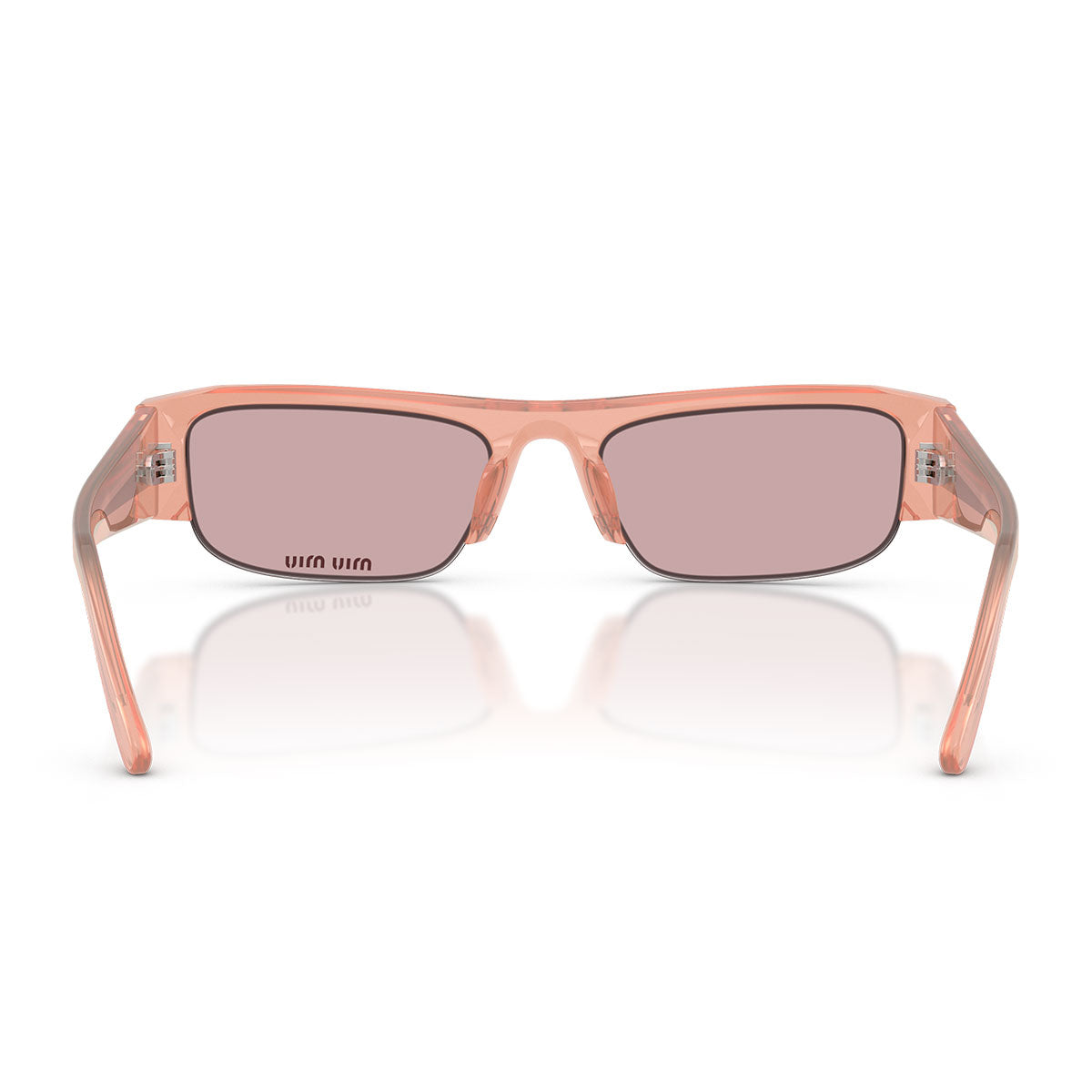 Le aste sottili, impreziosite dal logo verticale Miu Miu in metallo dorato, aggiungono un tocco di brillantezza senza appesantire il look, mantenendo un’estetica pulita e moderna.