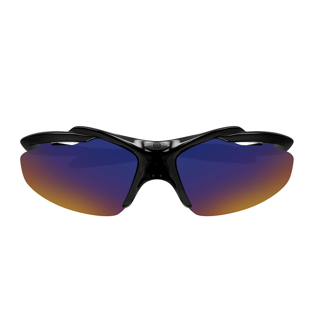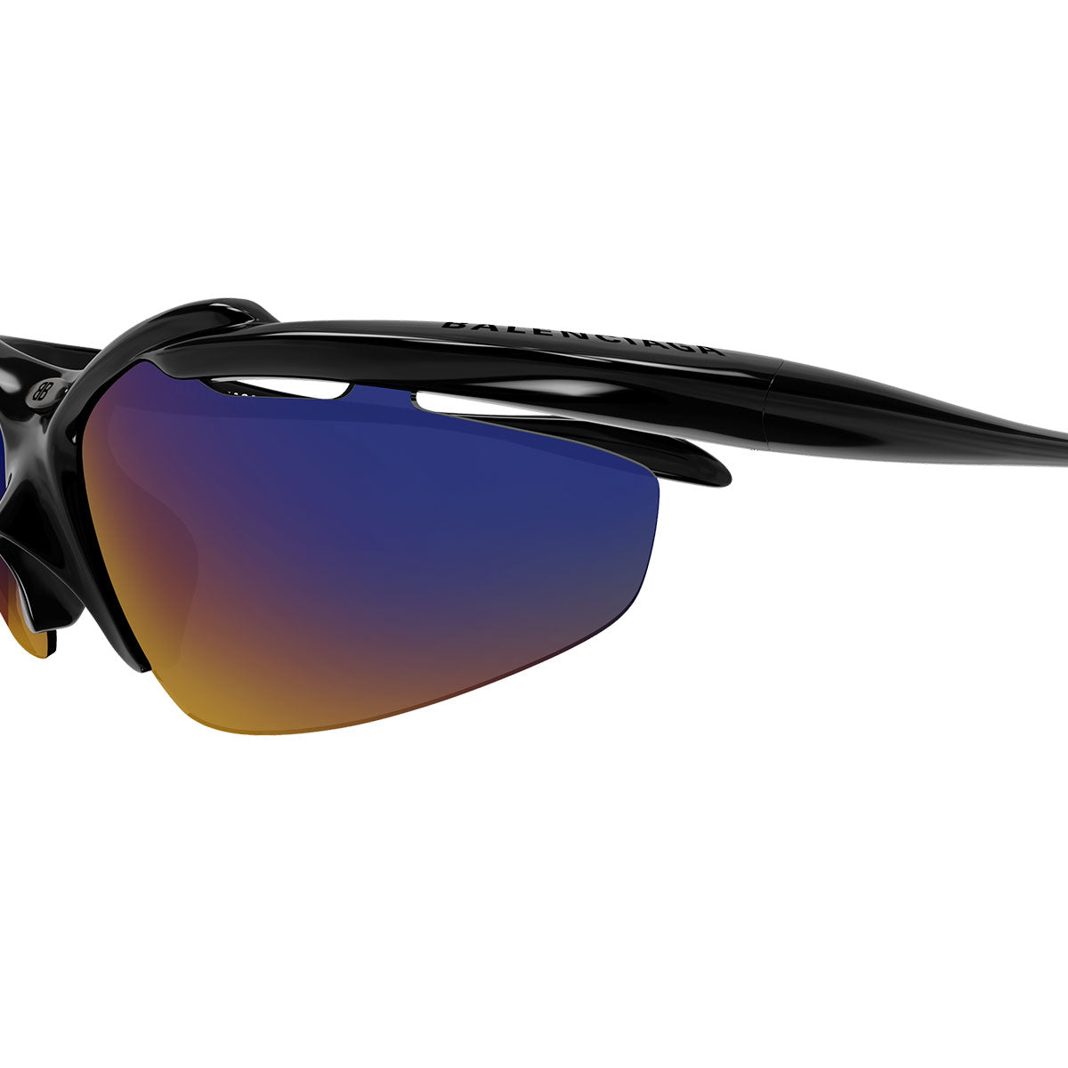 Die unisex ovale und umschließende Form sorgt für eine leistungsfähige Passform und einen markanten Look. Die ikonischen Details der Marke stärken die Identität: metallene Plakette mit BB-Logo, angebracht auf Nasenhöhe und Logo mit Balenciaga-Schriftzug in Relief auf der oberen Seite der Nasenflügel, linke Seite.