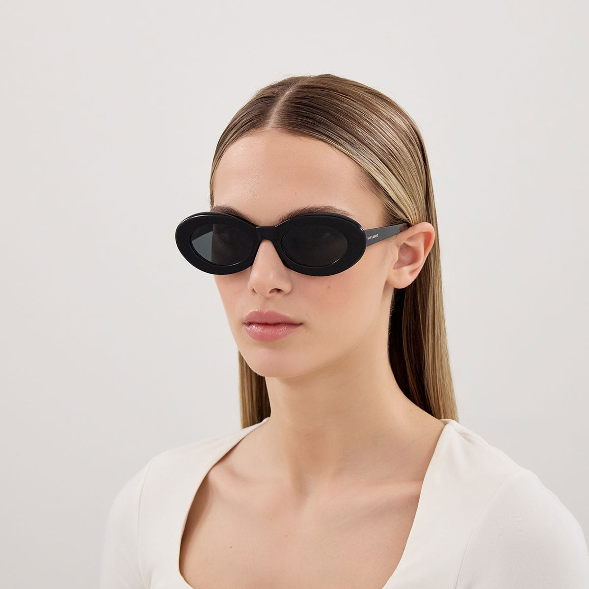 Die Saint Laurent SL 594 Sonnenbrille besticht durch einen markanten Acetatrahmen, inspiriert von Anthony Vaccarellos kreativer Vision. Die feminine ovale Form verleiht Eleganz und Modernität, während das eingravierte Saint Laurent-Logo auf den Bügeln ein markantes, raffiniertes Detail darstellt. Ein markantes, modernes Modell, perfekt für alle, die einen markanten, anspruchsvollen Stil lieben.