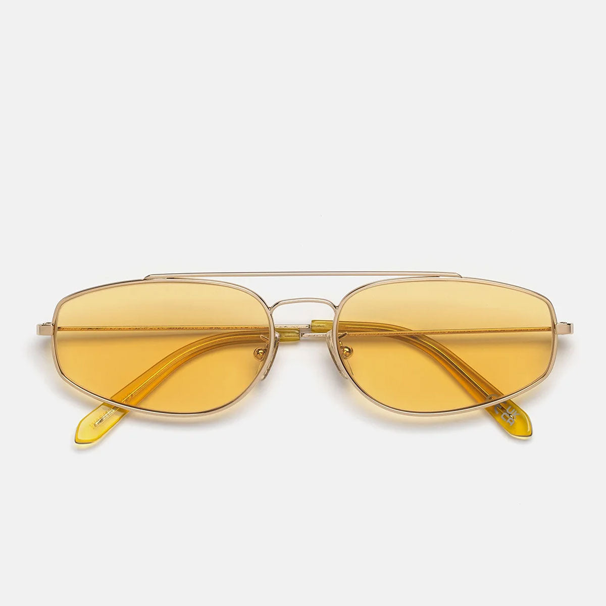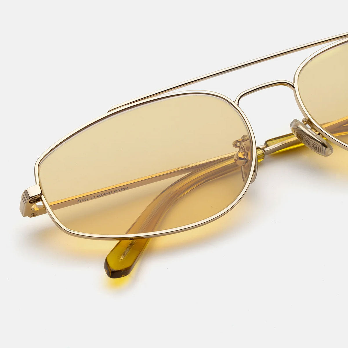 Diese Version verfügt über eine raffinierte Vergoldung , kombiniert mit senffarbenen Ton-in-Ton- Gläsern und weichen senffarbenen Acetat-Bügelenden für einen eleganten und originellen monochromen Look.