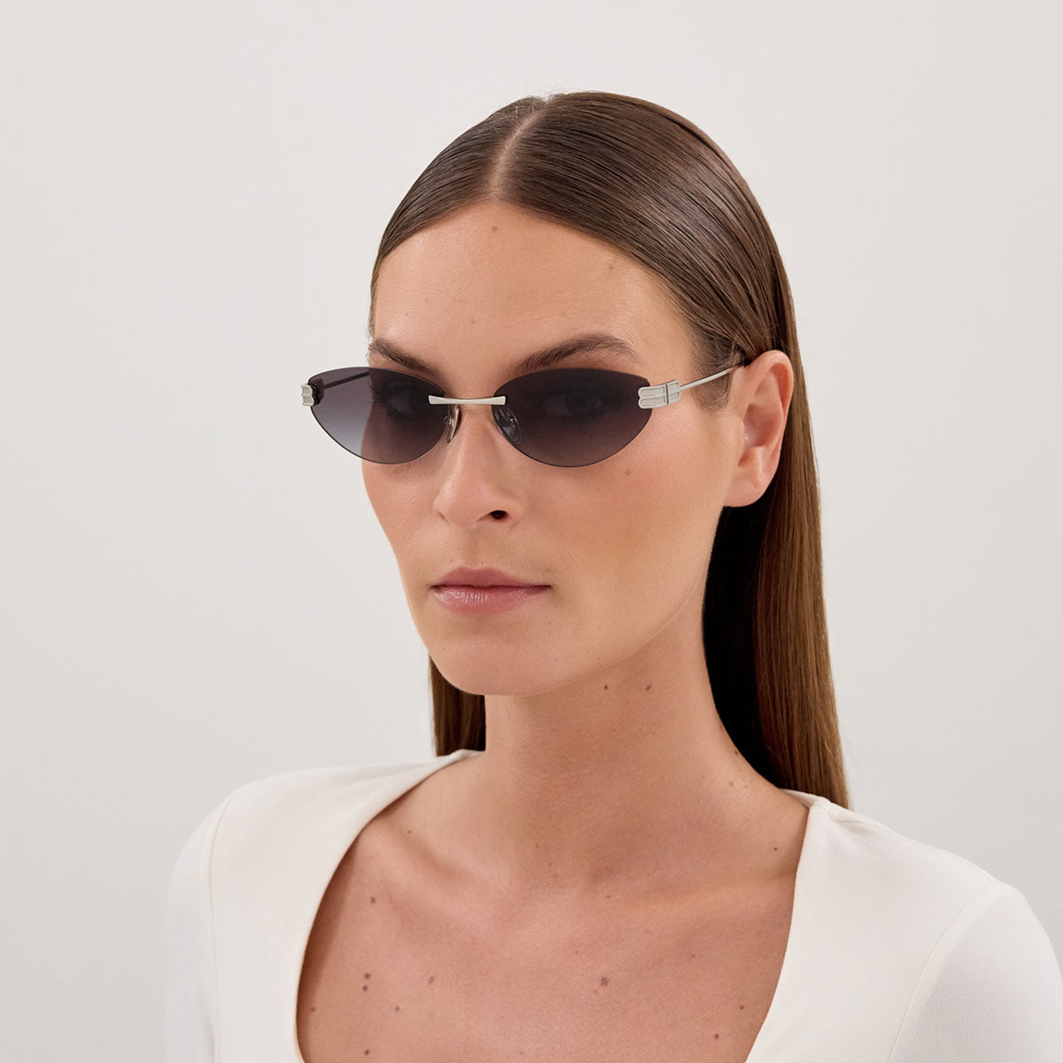 Die weiche, katzenaugenförmige Damenform betont die Gesichtszüge mit einem harmonischen und zeitgemäßen Design. Exklusiv macht das Modell das BB-Logo in Relief, kombiniert mit einer feinen, sandgestrahlten Oberfläche im Inneren der Buchstabenöffnungen, die ein elegantes Spiel aus Strukturen und Kontrasten mit der glänzenden Oberseite erzeugt.