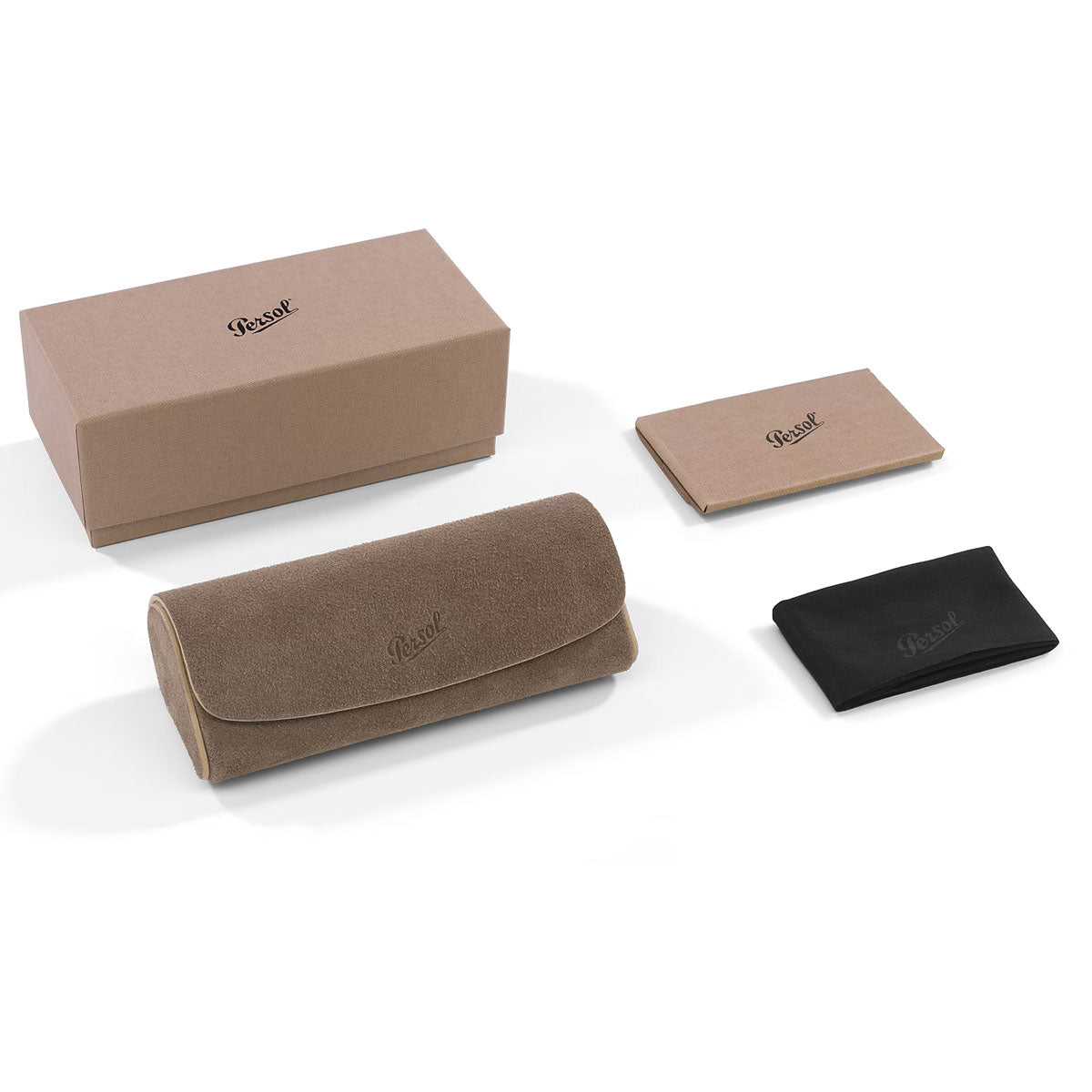 Dieses Modell stellt eine moderne Neuinterpretation eines Archivdesigns dar und unterstreicht einmal mehr Persols Fähigkeit, Innovationen zu schaffen und gleichzeitig die Tradition zu respektieren. Das markante Detail ist der Supreme-Pfeil mit ovaler Spitze auf der Vorderseite des Acetatrahmens: eine Anspielung auf die Vergangenheit, neu interpretiert mit einem zeitgenössischen Touch.