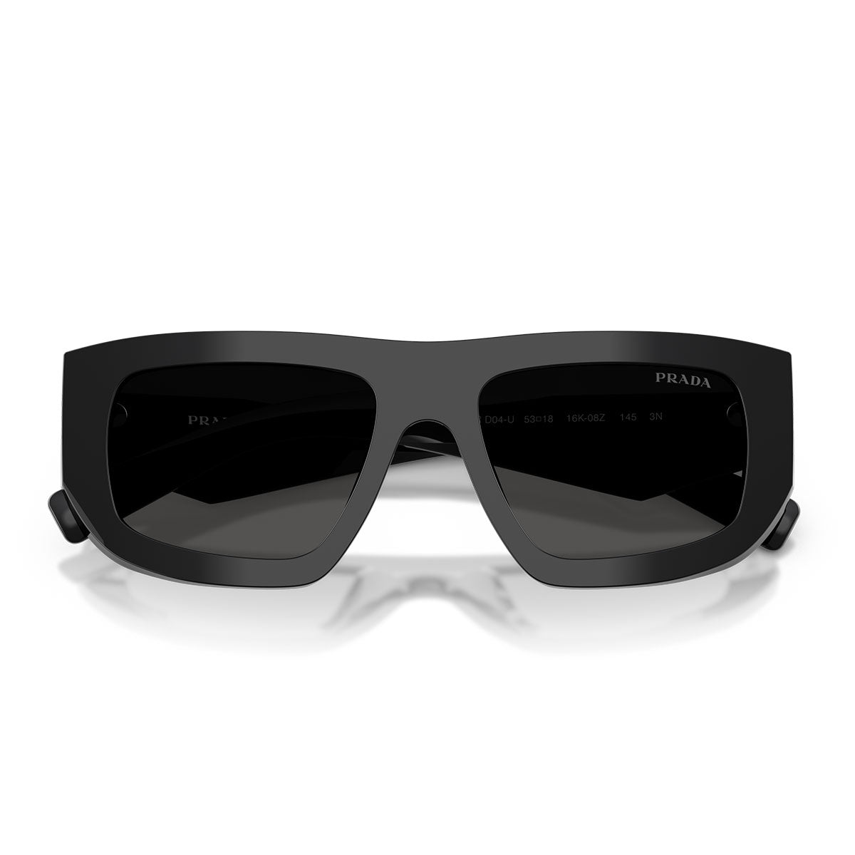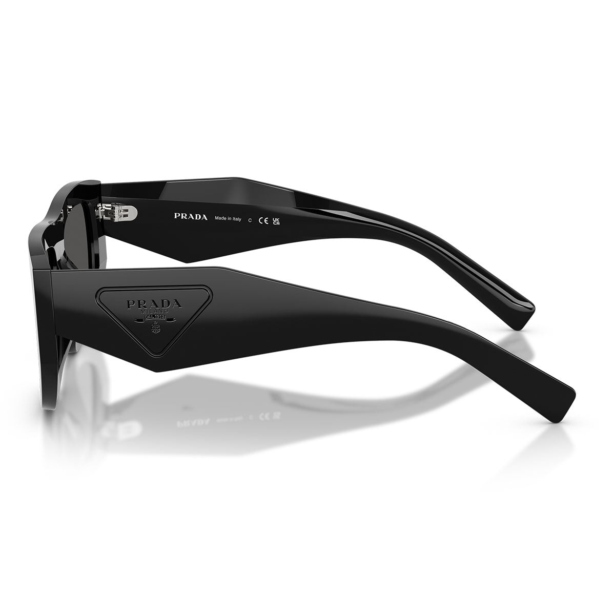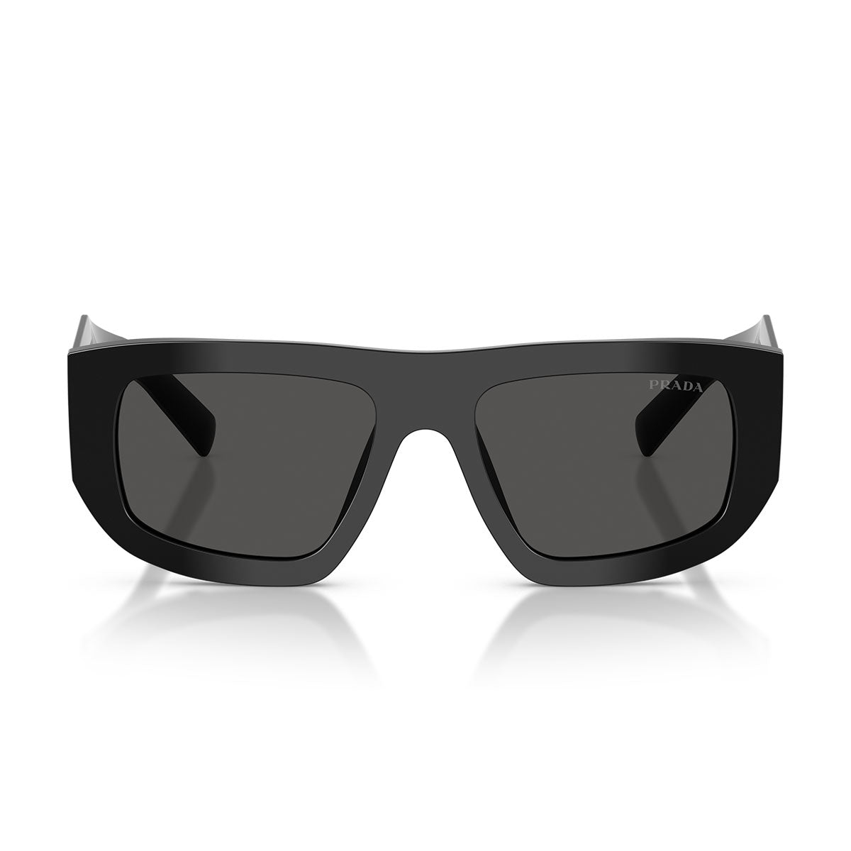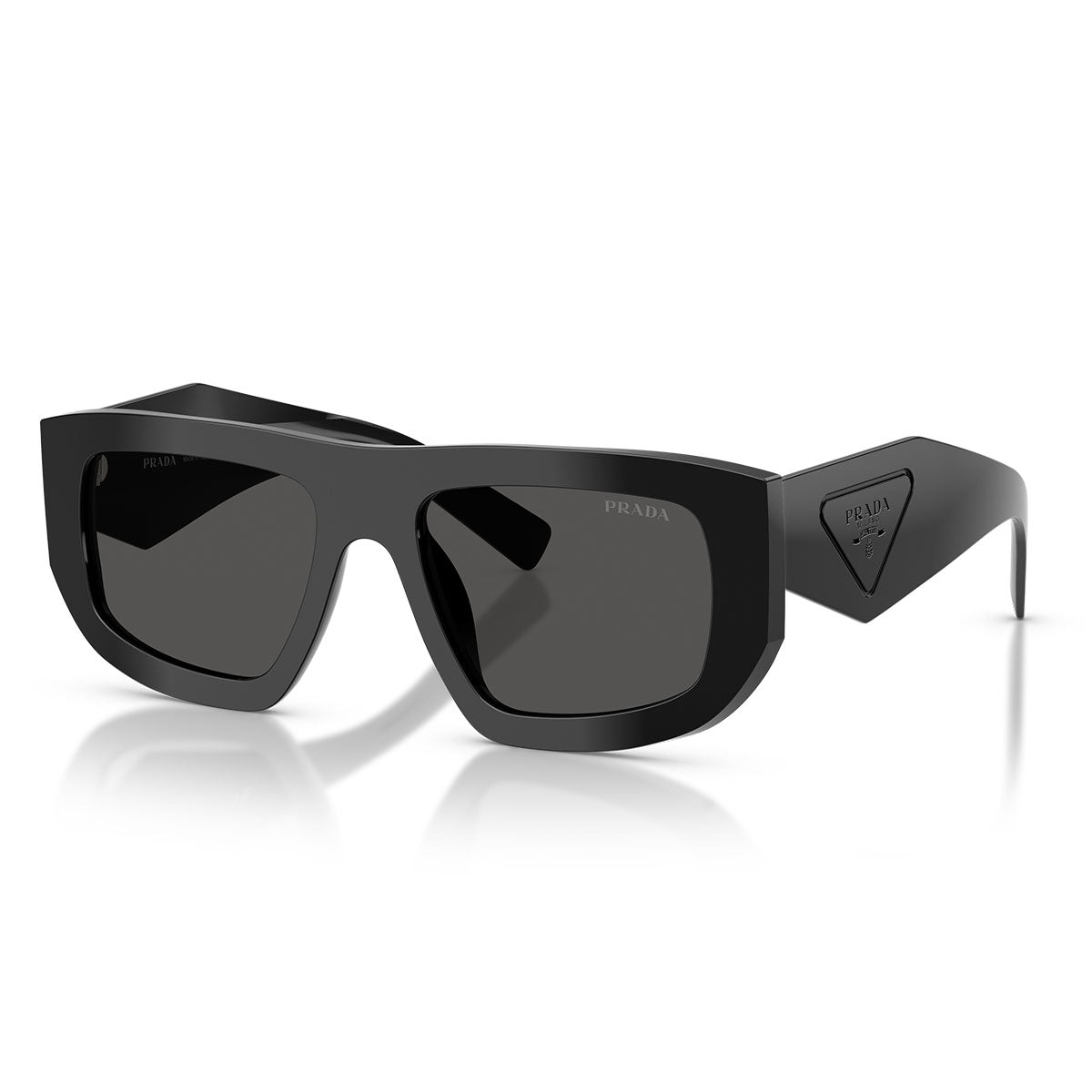 Diese rechteckigen Sonnenbrillen zeichnen sich durch die flache Browline und eine moderne Silhouette aus, die perfekt mit den breiten und geometrisch gewinkelten Bügeln verbunden ist, einem charakteristischen Merkmal des Prada-Designs. Auf den Bügeln befindet sich das ikonische dreieckige Prada-Logo, präzise graviert und emailliert, für ein raffiniertes und sofort erkennbares Detail.