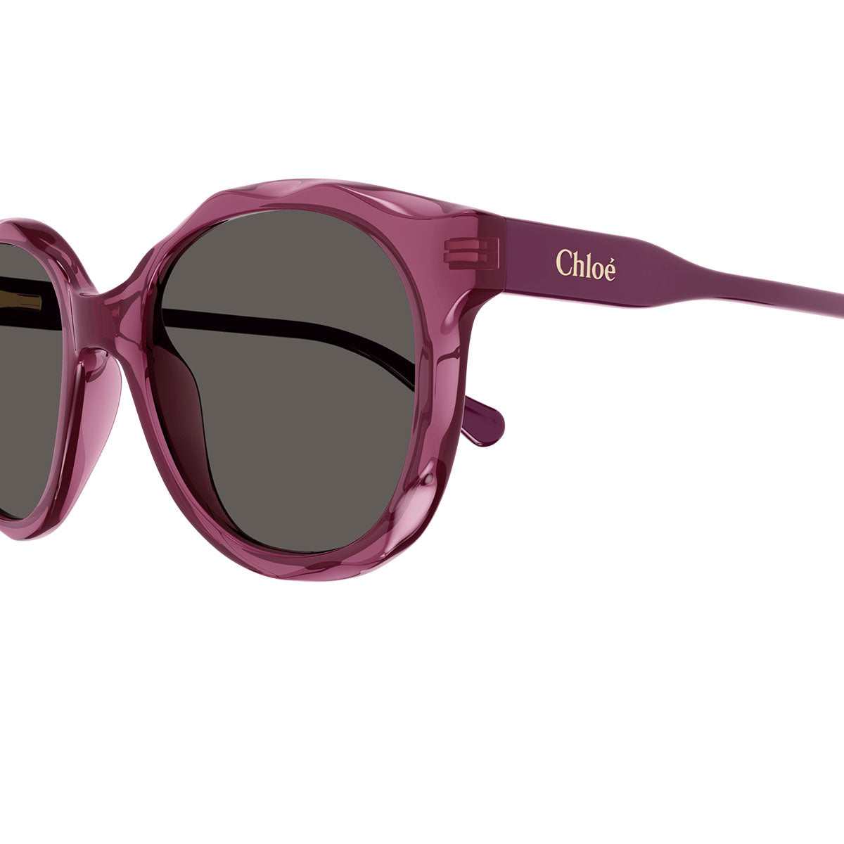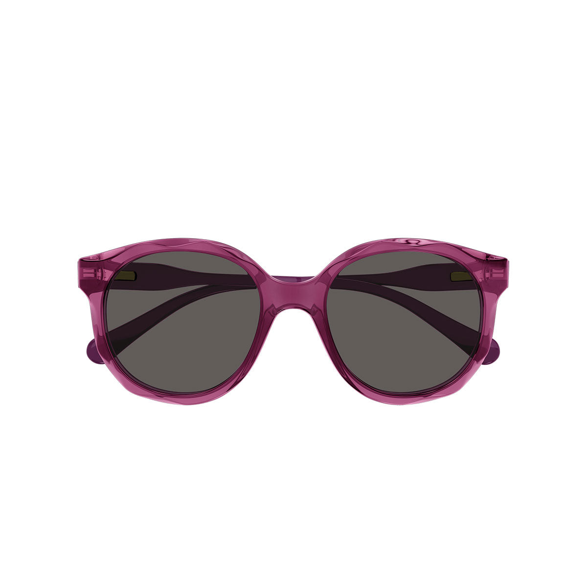 The round acetate frame is enhanced by a delicate milled wavy pattern on the rims, a distinctive and feminine detail. The transparent front adds lightness and brightness, while the temples in bright tone-on-tone solid colors add a playful yet refined touch.