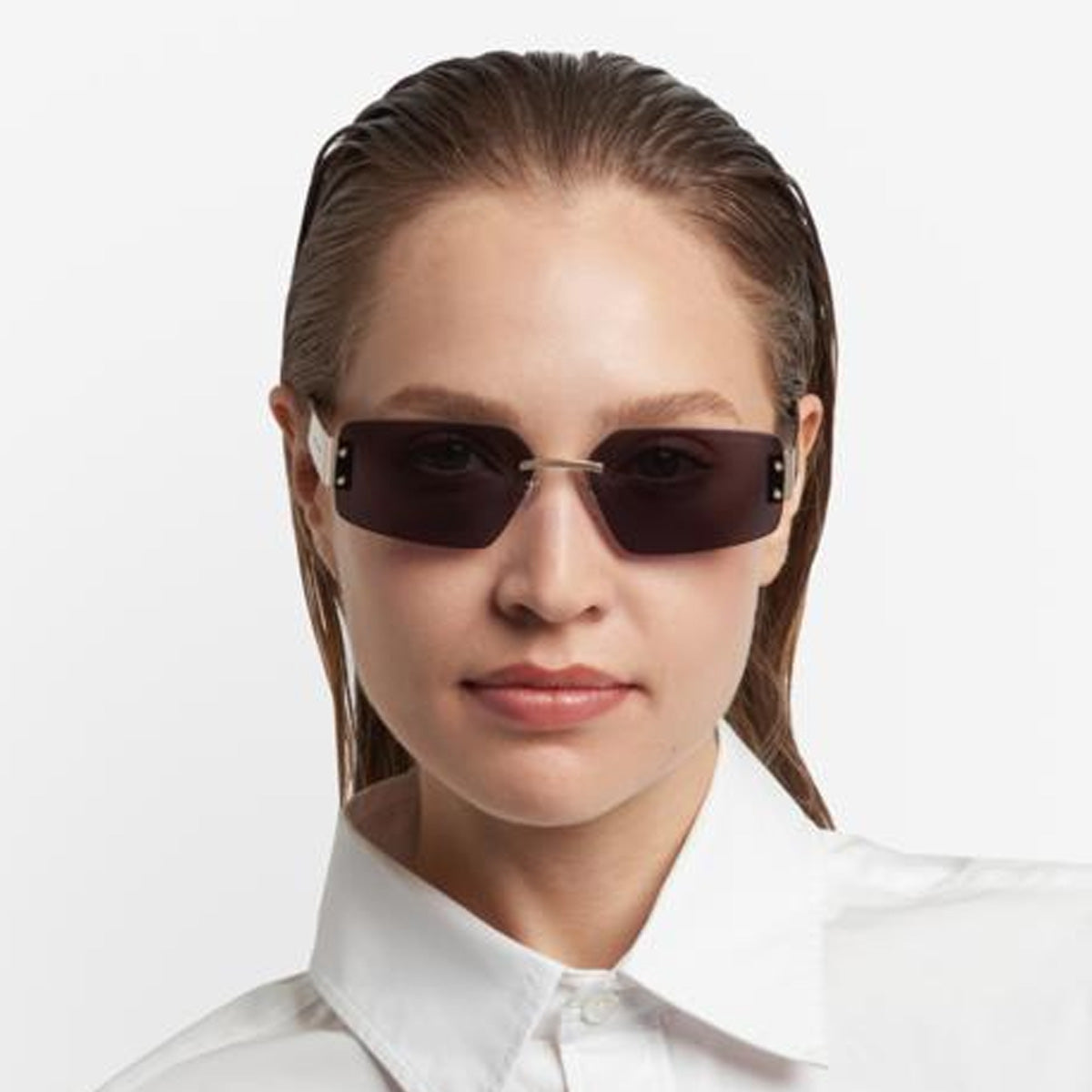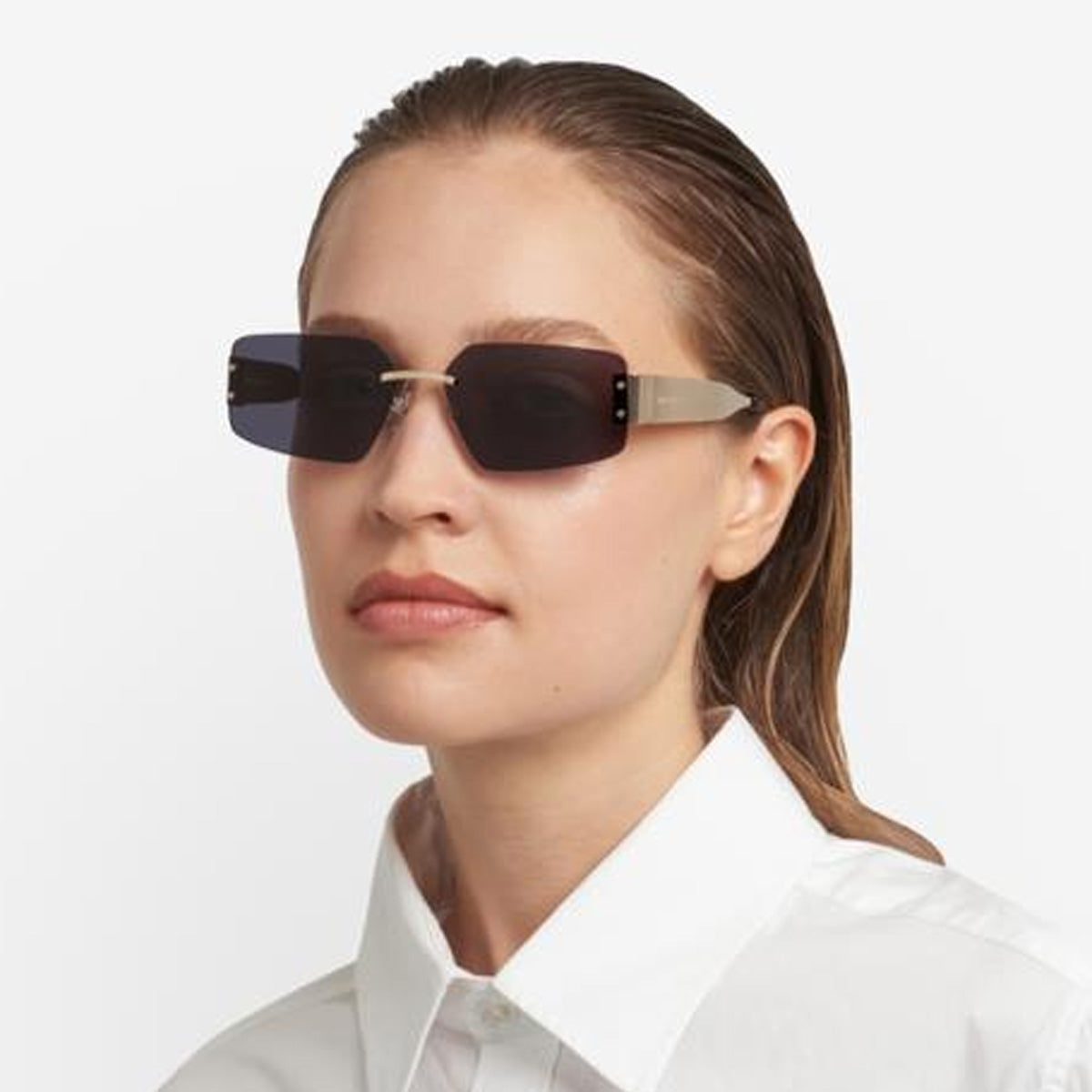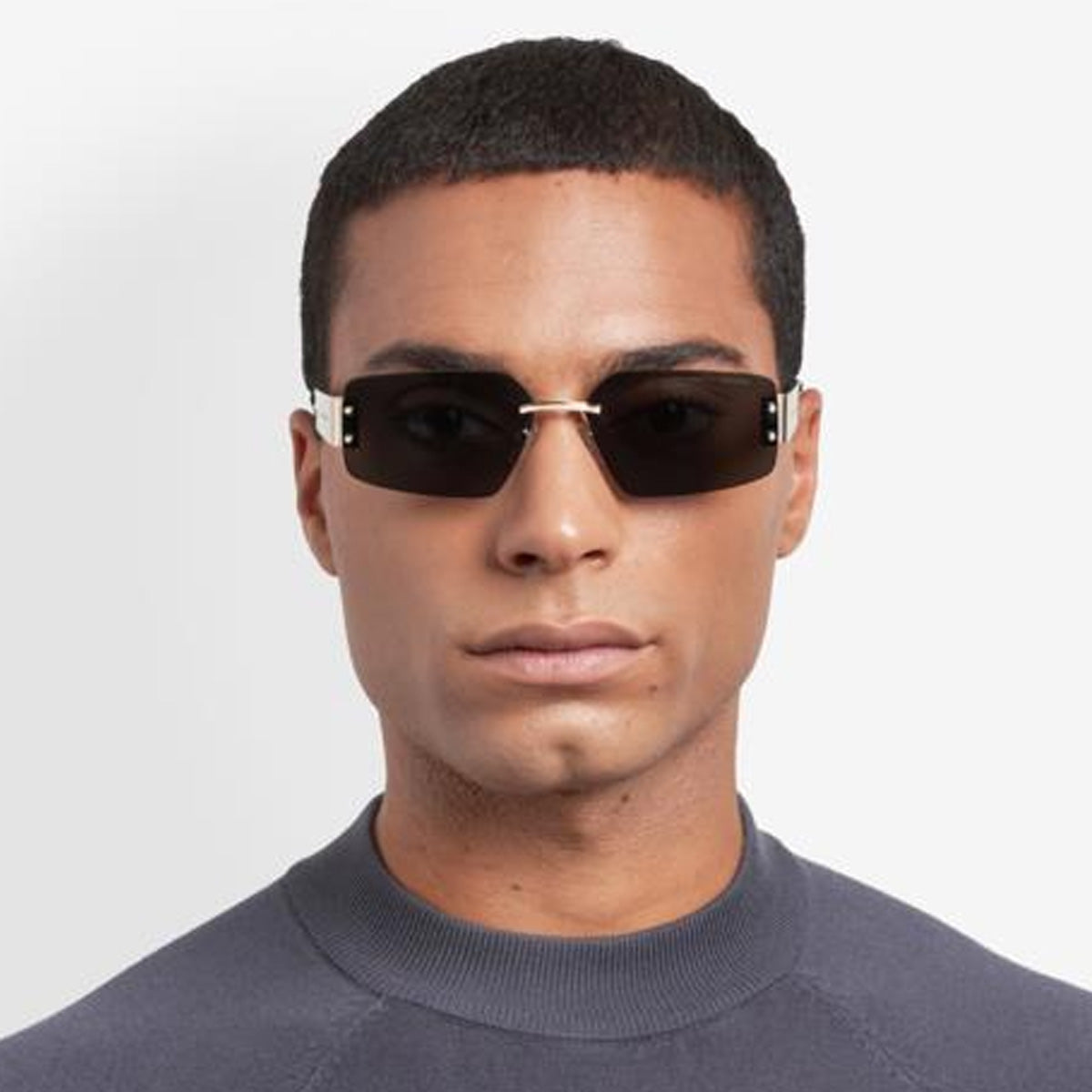The glasses feature an impactful rimless frame, with a metal structure that provides visual lightness and character. The wide temples, enhanced by acetate end pieces, ensure comfort and stability, perfectly fitting behind the ear.