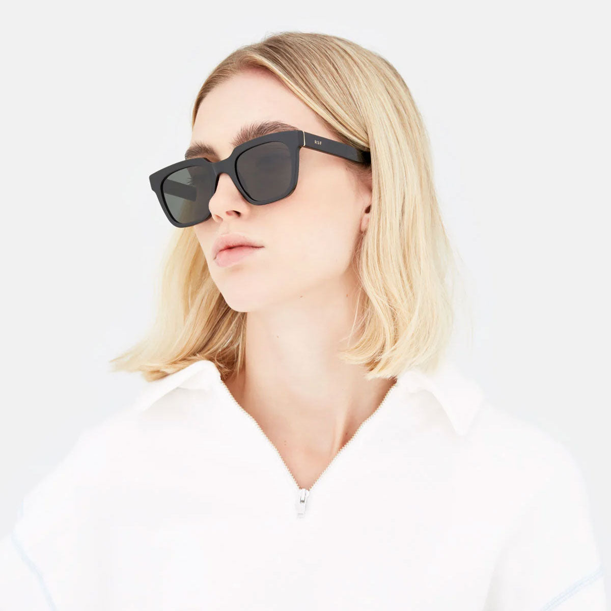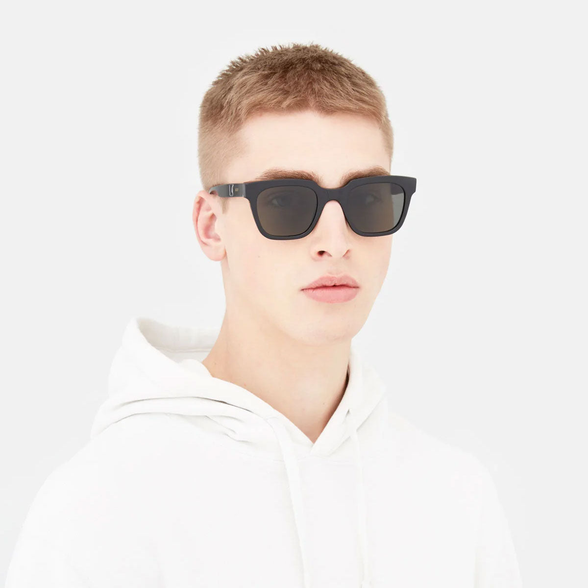 Made of thick and durable acetate, these glasses feature large geometric lenses that give a bold and refined look. In this version, the glossy black acetate frame pairs with black lenses, for a bold and distinctive style.