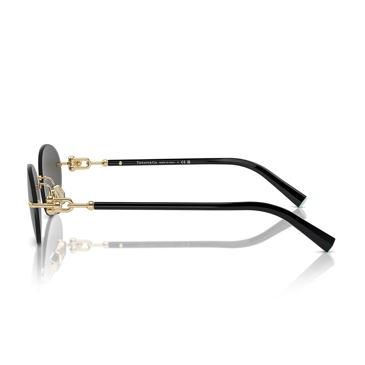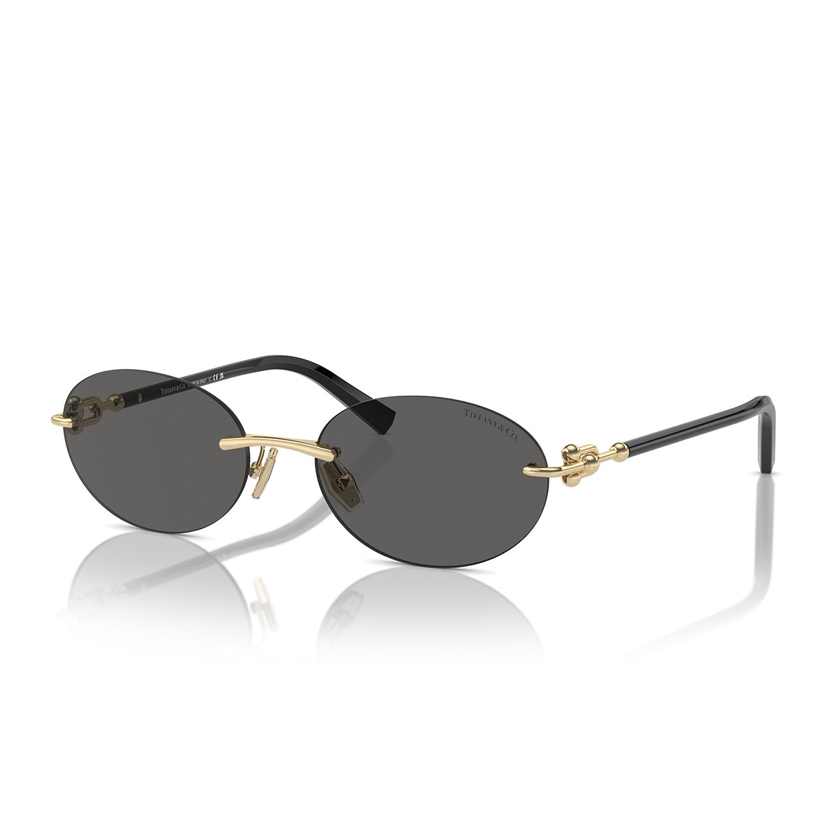 Tiffany & Co. TF3104D merges the elegance of eyewear with the art of jewelry, creating an oval sunglasses model designed exclusively for the Japanese market. Featuring a rimless frame and bio-acetate temples, these glasses are enhanced by innovative hinges that echo the famous HardWear metal mesh, offered in refined light gold or rose gold finishes.