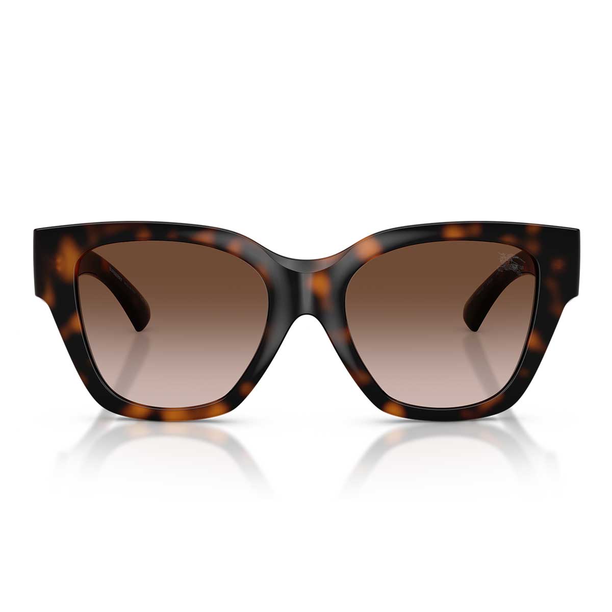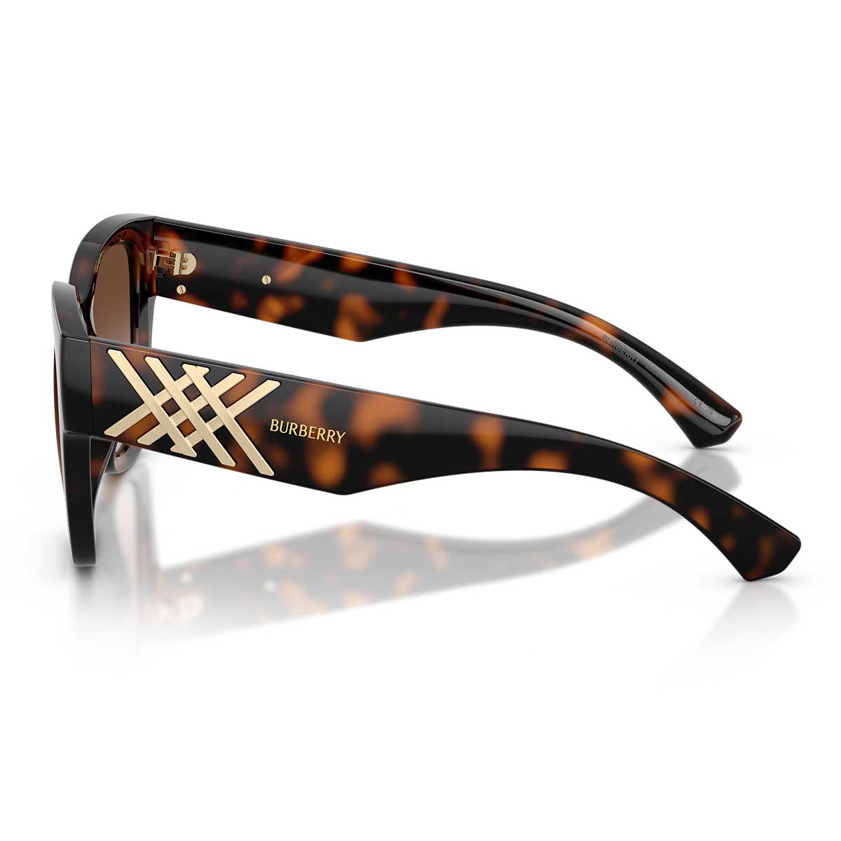 The temples are enriched with iconic brand details: the Burberry logo and a refined gold-tone metal check pattern with a textured finish, adding a touch of luxury and recognizability to the design.