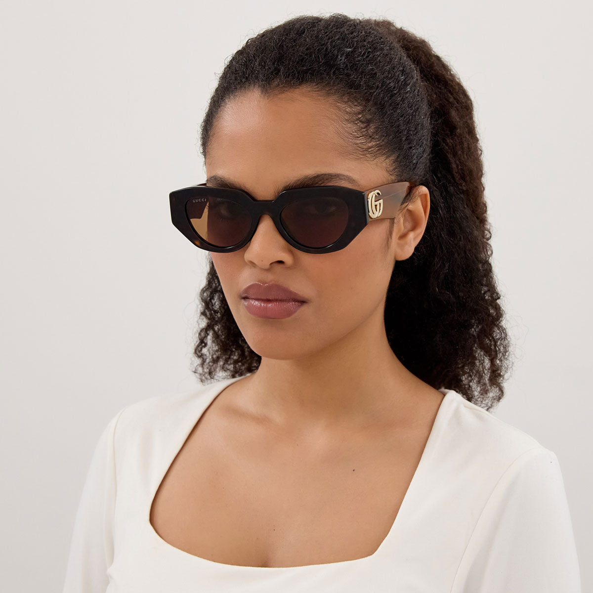 The color palette includes two SKUs in classic and versatile tones, alongside two bolder variants: the refined petrol Havana and the iconic Gucci pink. Completing the assortment, a reference fully decorated with rhinestones, for a striking and sparkling look.