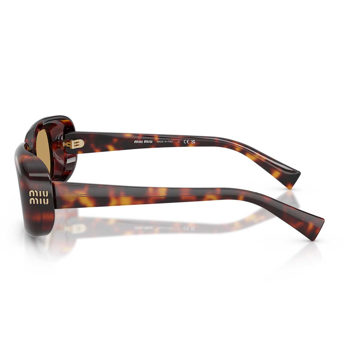 The thin temples connect harmoniously to the spoiler, where the vertical Miu Miu metal logo stands out, an iconic element expressing the brand’s full identity.