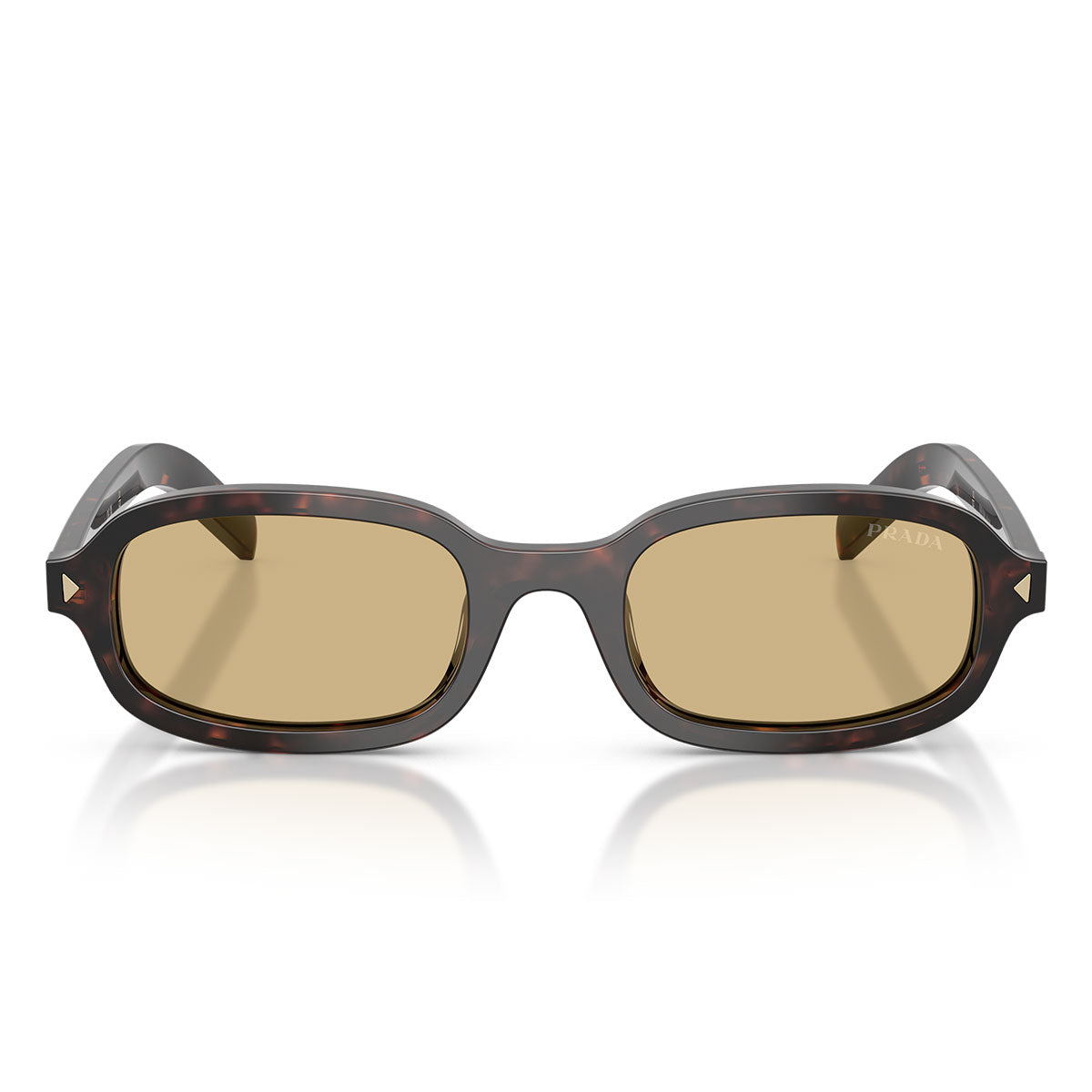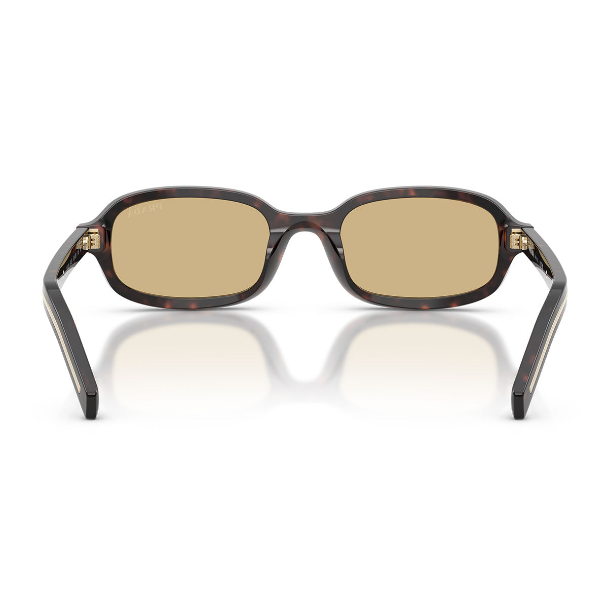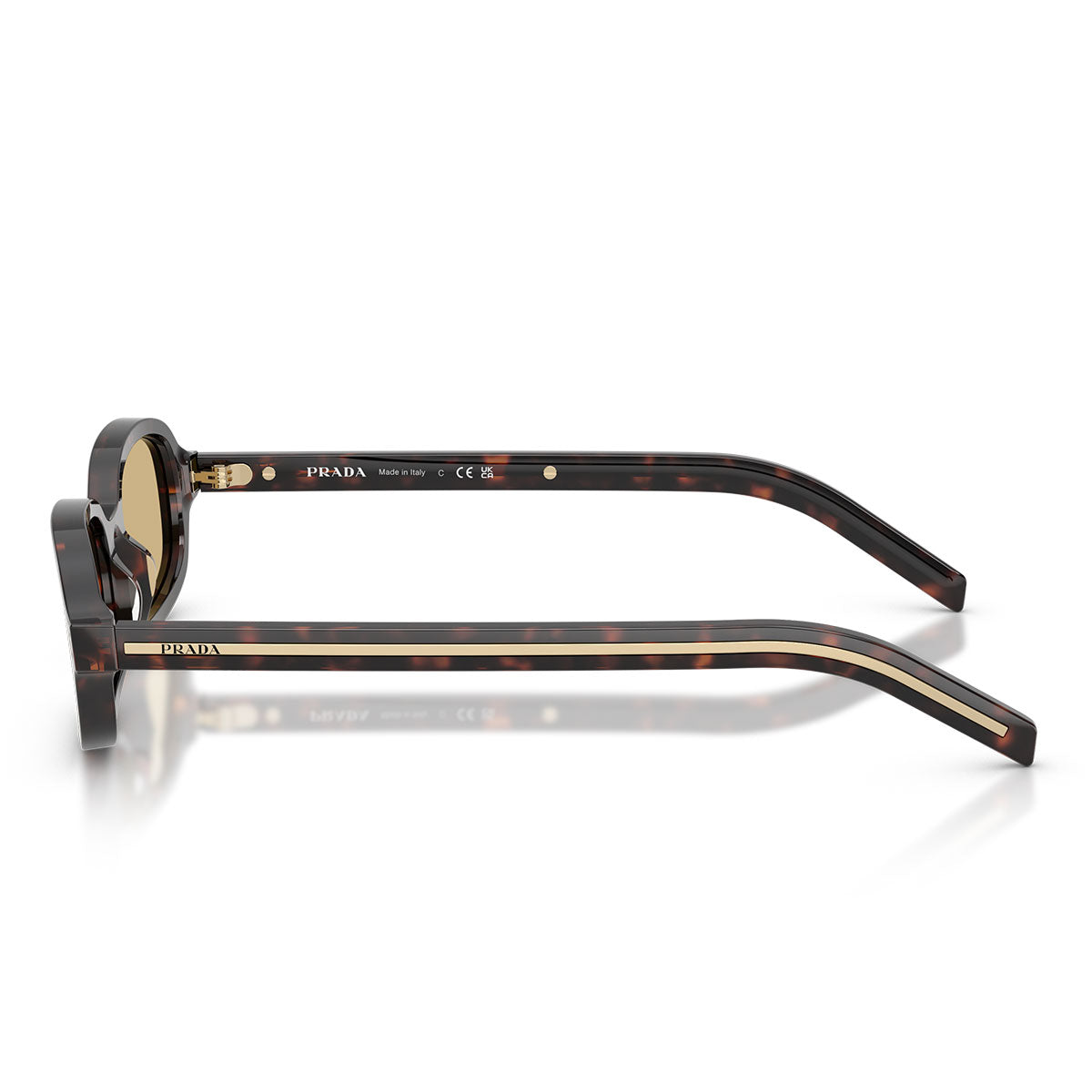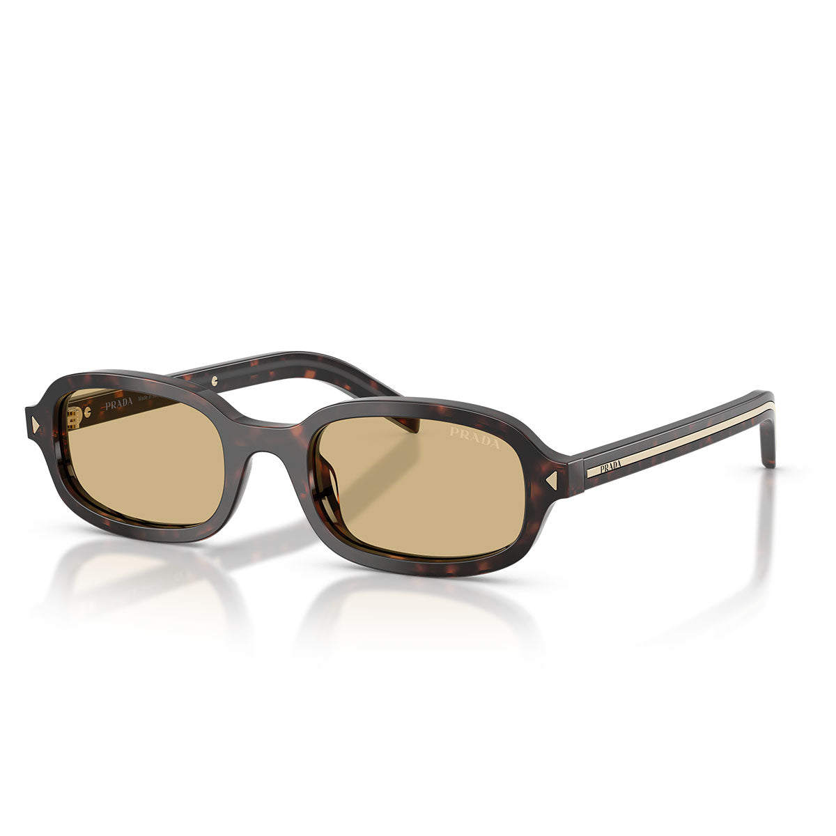 The frame features a harmonious oval shape, with soft lines and balanced proportions that express sophisticated simplicity. The thin temples are enhanced by elongated Prada logo plaques, made of metal with shiny finishes often in tonal contrast with the acetate, for an elegant and modern effect.