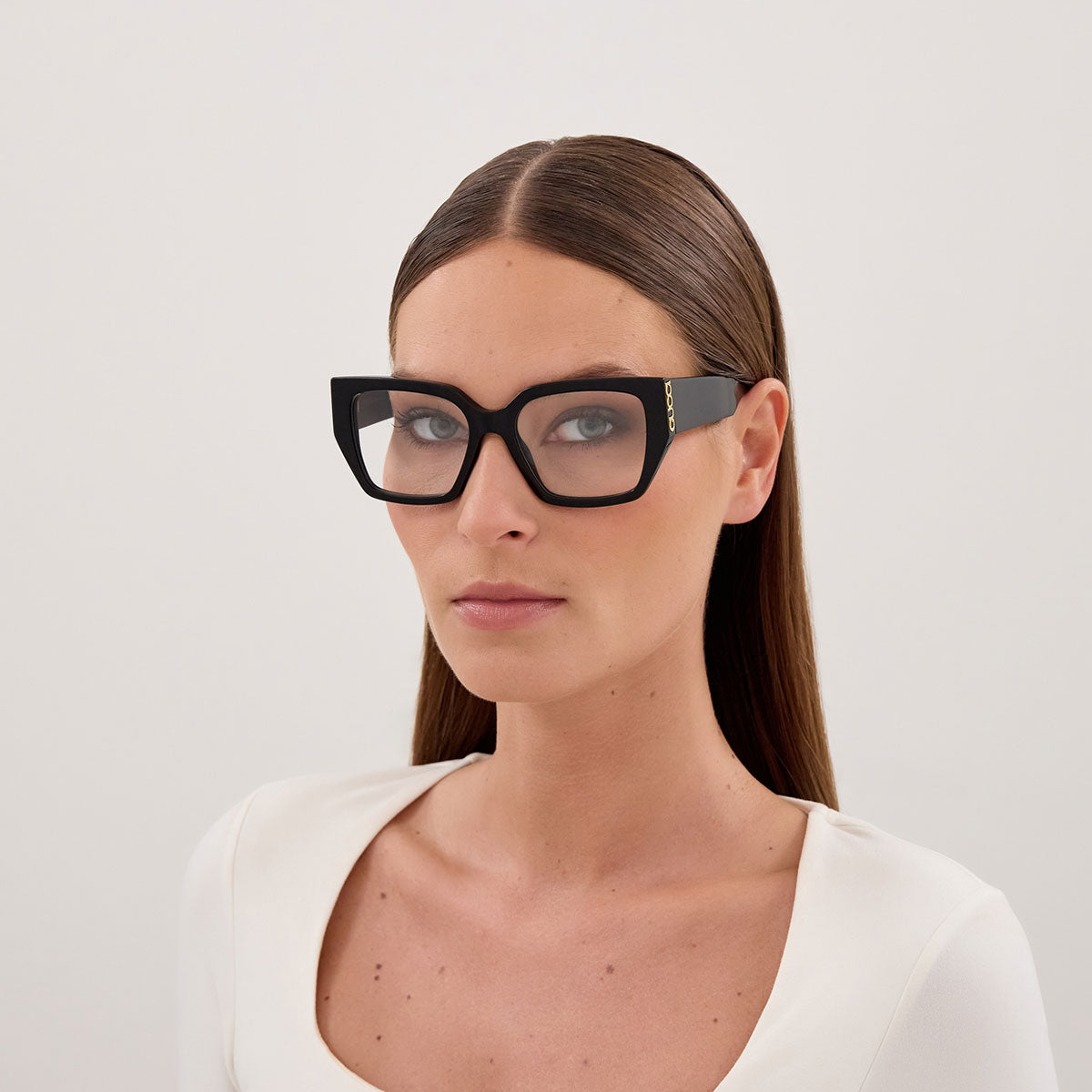 La forma mariposa caracteriza este modelo con líneas femeninas y dinámicas, capaces de realzar el óvalo del rostro con distinción sin resultar exageradas. La montura de aro completo asegura solidez y un aspecto decidido, mientras que varios colores disponibles (como negro brillante, avellana oscuro o doble capa animal print) ofrecen opciones versátiles para cada estilo.