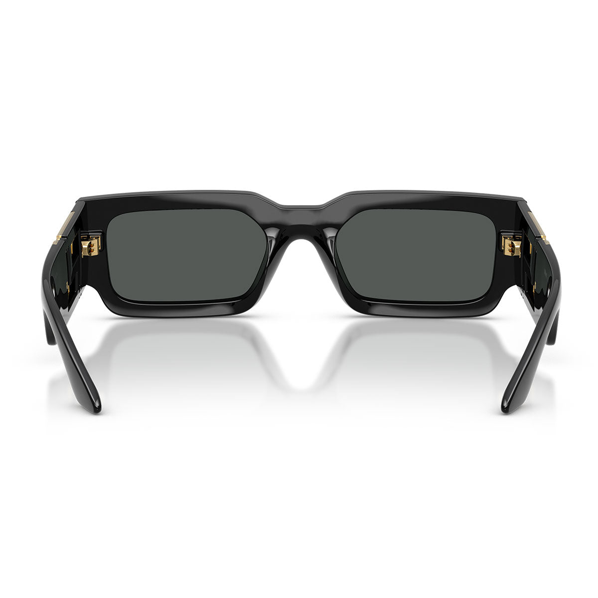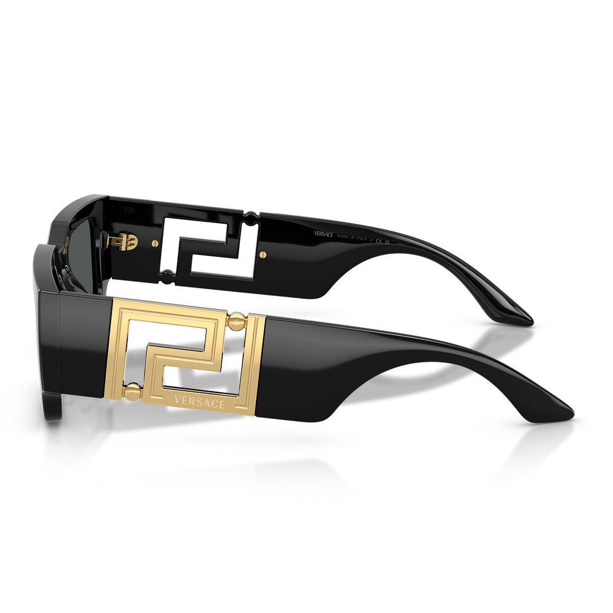 Las varillas protagonistas del diseño están enriquecidas con un módulo de metal dorado con motivo Greca calado, uno de los símbolos más icónicos de la maison. Este elemento escultórico capta inmediatamente la atención y otorga a las gafas una estética opulenta y llamativa, perfectamente alineada con la filosofía Versace: “more is more”.