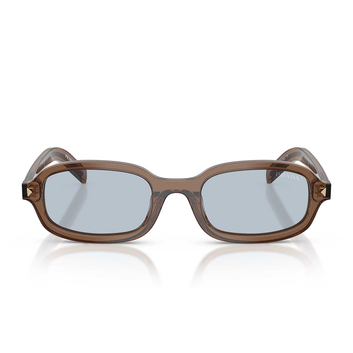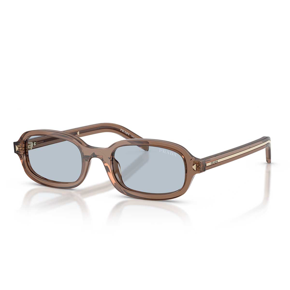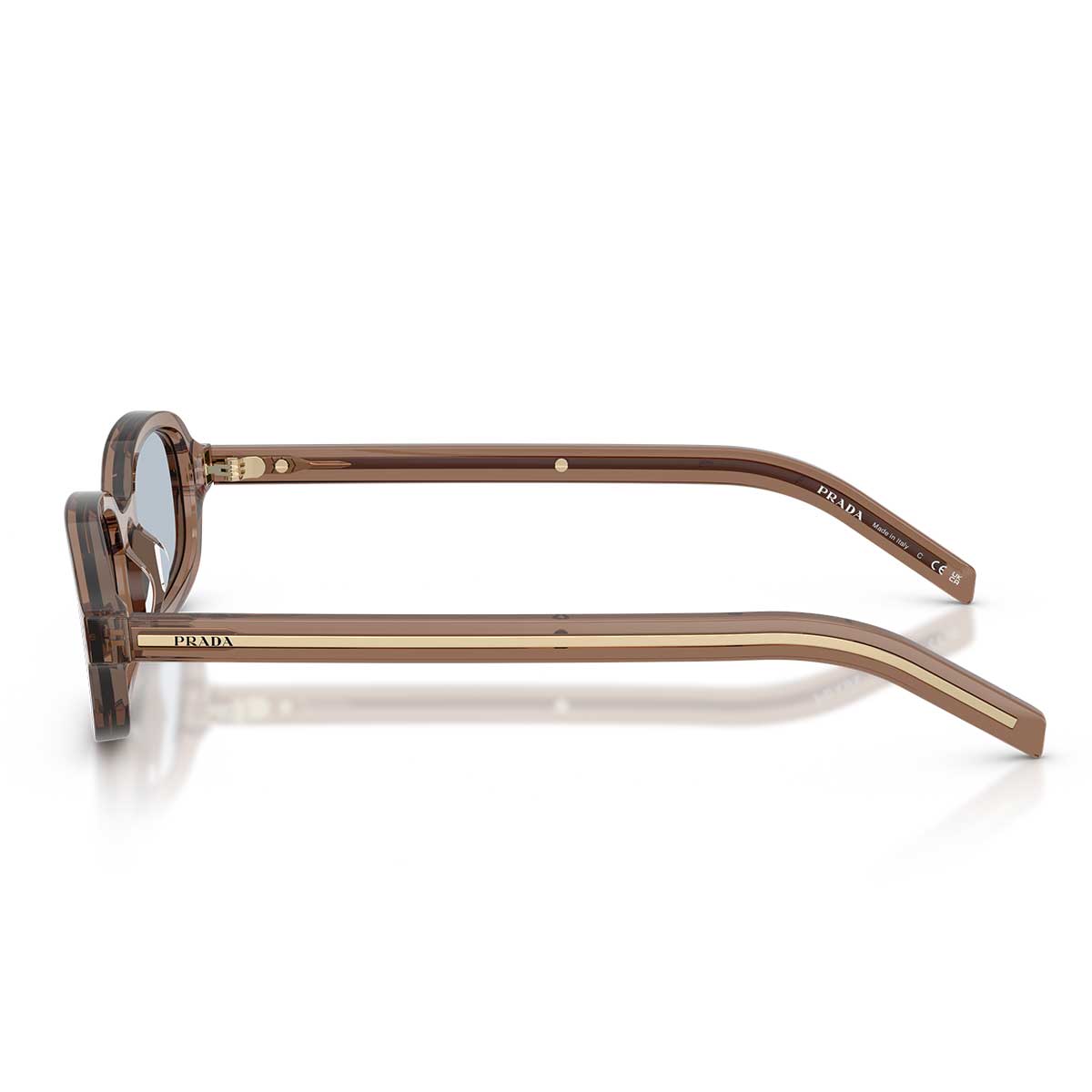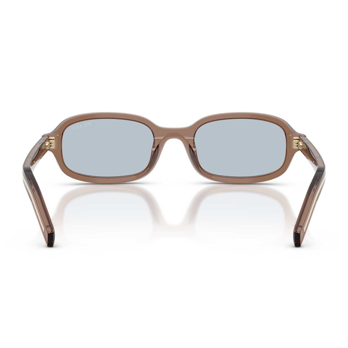 La montura presenta una forma ovalada armoniosa, con líneas suaves y proporciones equilibradas que expresan una sofisticada simplicidad. Las varillas delgadas están adornadas con placas alargadas con el logo Prada, realizadas en metal con acabados brillantes a menudo en contraste tonal con el acetato, para un efecto elegante y moderno.