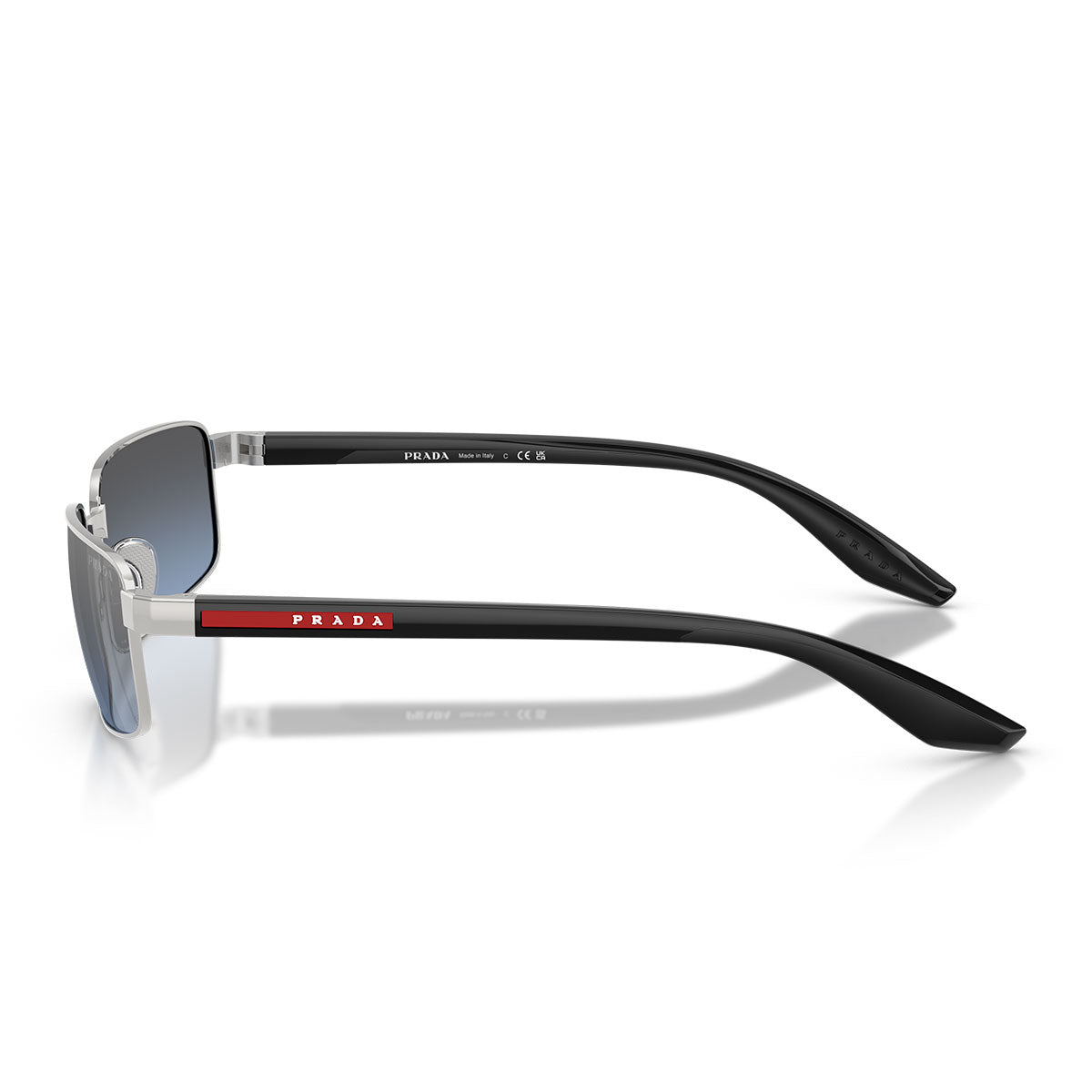 La forme rectangulaire raffinée est réalisée avec une fabrication en matériaux mixtes, qui associe la face avant en métal aux branches en nylon injecté, légères et résistantes. Le célèbre logo en caoutchouc Prada Linea Rossa, bien visible sur les branches, signe le modèle d’un détail iconique et immédiatement reconnaissable.