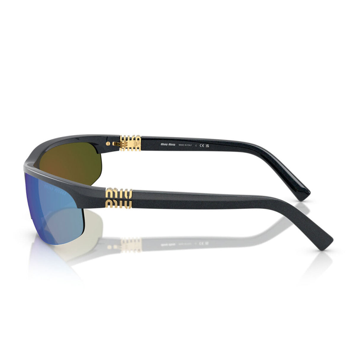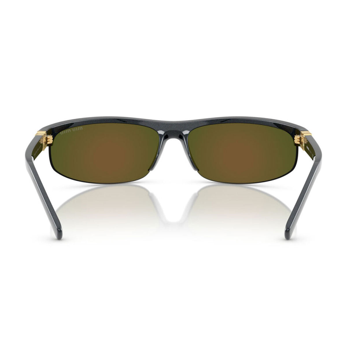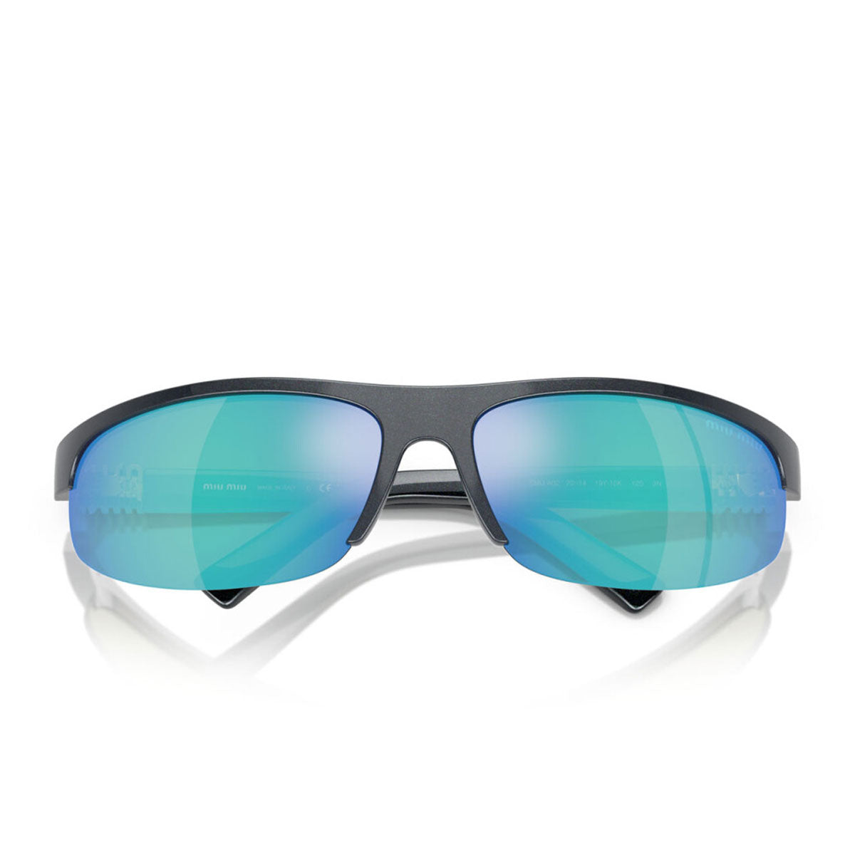 Owiewające soczewki o nowoczesnym kroju są prawdziwymi bohaterami: dostępne w odważnych lustrzanych kolorach, takich jak różowy i niebieski, nadają wyglądowi zdecydowany wizualny efekt. Dostępne także w wariancie full-fitting, ten innowacyjny design uzupełnia pionowe logo Miu Miu wkomponowane w zawias, ikoniczny i rozpoznawalny detal.