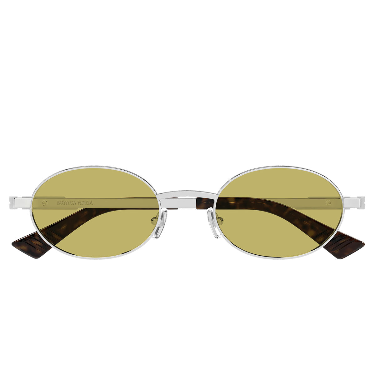 Elemento distintivo del design è il Ribbon allungato, firma inconfondibile di Bottega Veneta, che dona slancio, carattere e un raffinato accento architettonico alle aste. La struttura metallica valorizza le proporzioni ovali dell’occhiale, garantendo al tempo stesso leggerezza, comfort e una presenza elegante.