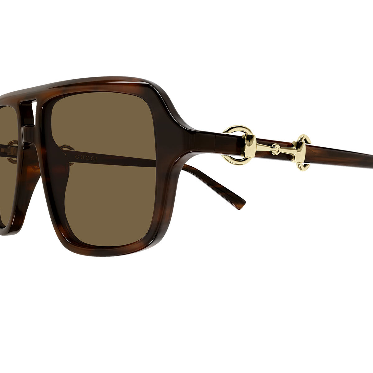 La struttura in acetato è impreziosita dall’iconico dettaglio Morsetto che attraversa l’asta, simbolo distintivo dell’universo Gucci. La montatura pilot con doppio ponte richiama un’estetica classica e sofisticata, perfetta per chi ama un design deciso ma raffinato.