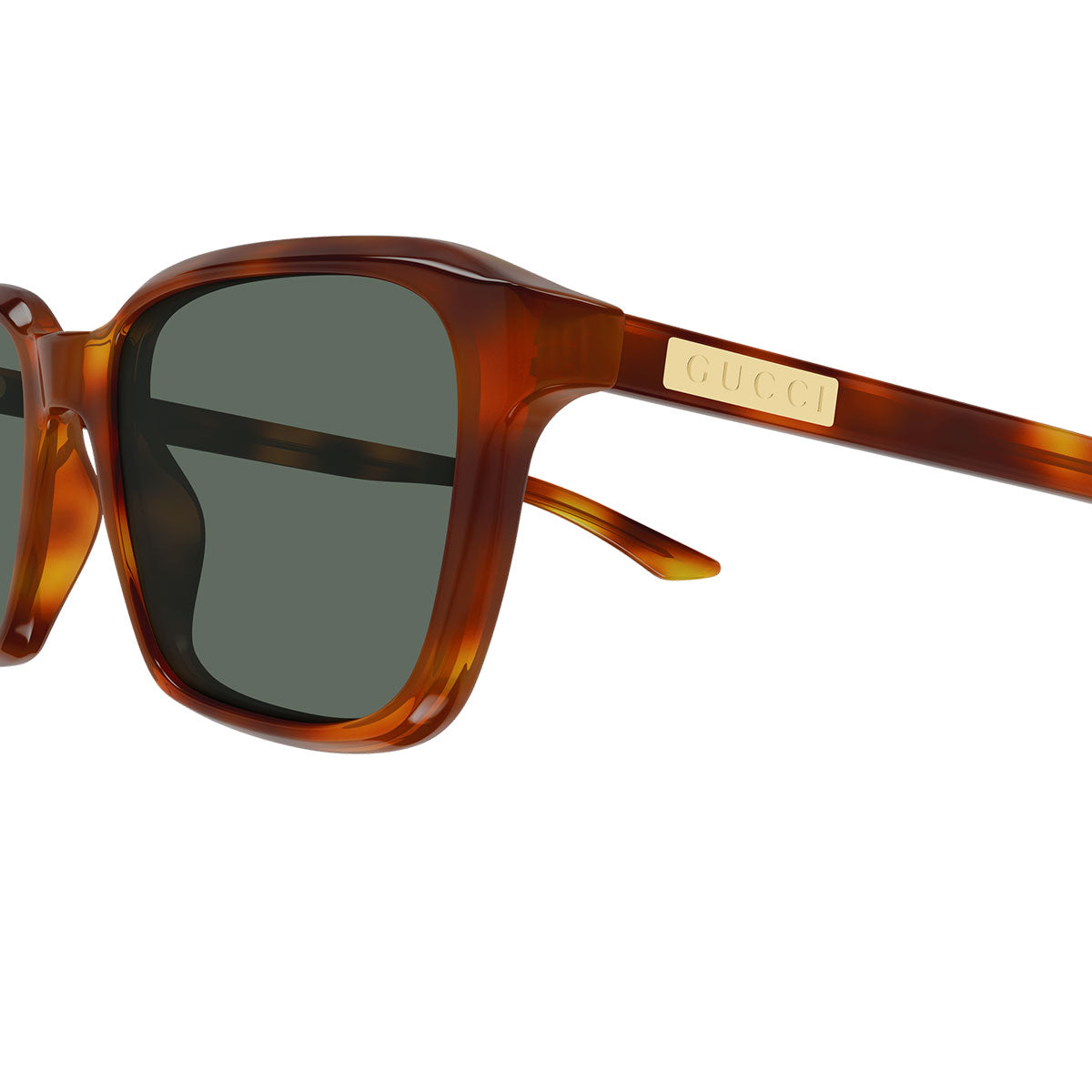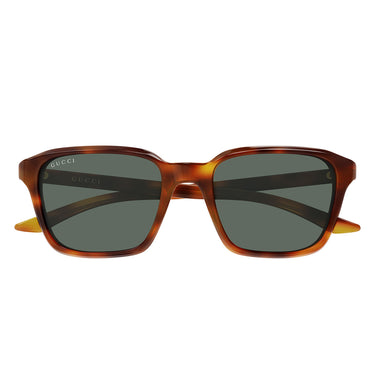 La forma squadrata maschile definisce il volto con carattere, mentre la targa logata Gucci applicata su entrambe le aste sottolinea l’identità iconica del brand. Il logo istituzionale Gucci, ben visibile su entrambi i lati, diventa protagonista di un design bold e di grande impatto visivo.