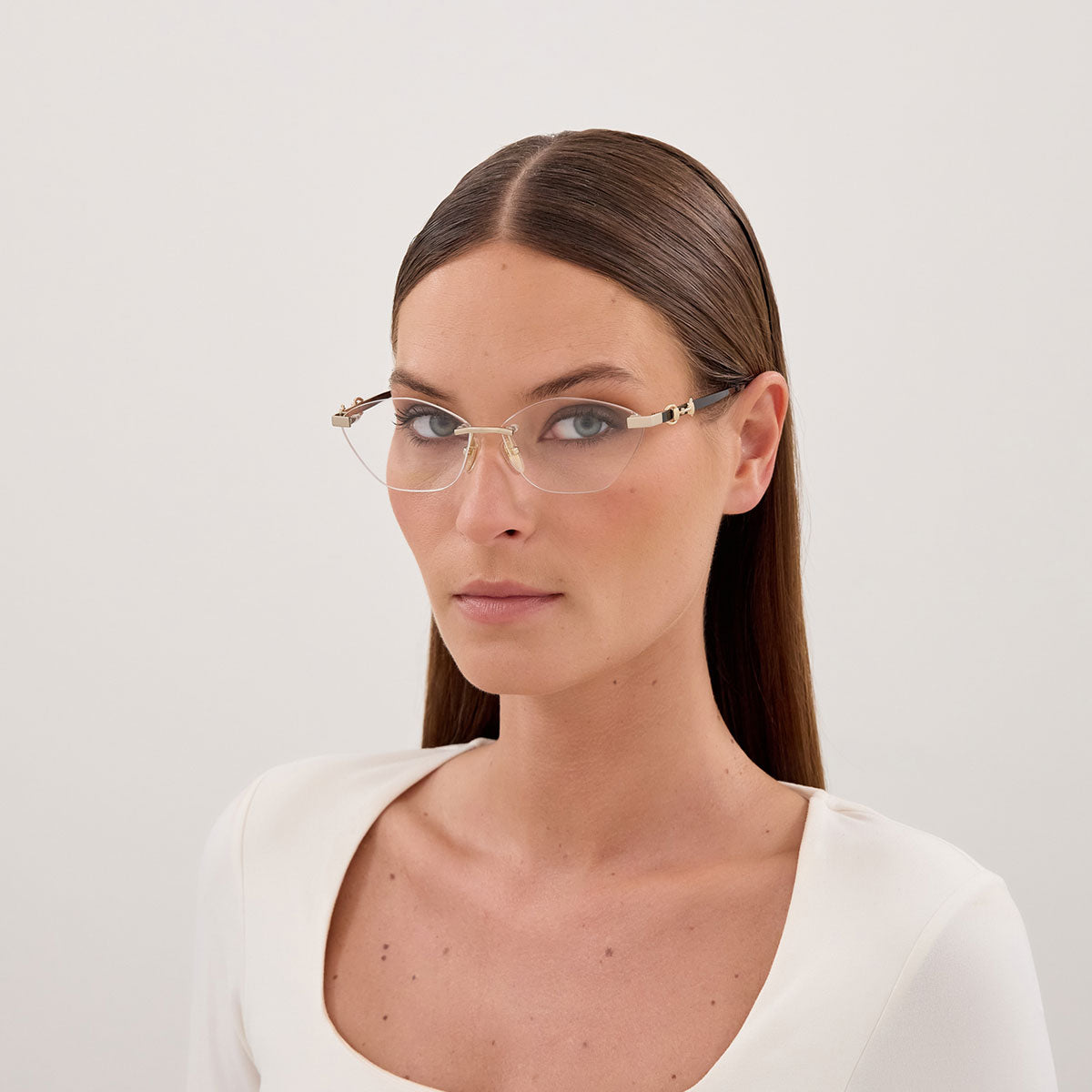 La struttura glasant (senza montatura) dona leggerezza visiva e raffinatezza, mentre la forma cat-eye geometrica valorizza il volto con uno stile femminile, deciso e di grande personalità. Protagonista assoluto è l’iconico dettaglio Morsetto, che attraversa l’asta diventando elemento distintivo e simbolo dell’heritage della Maison.