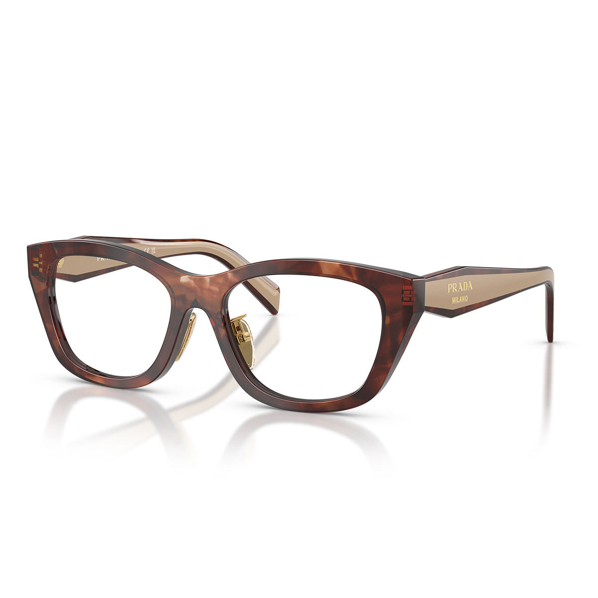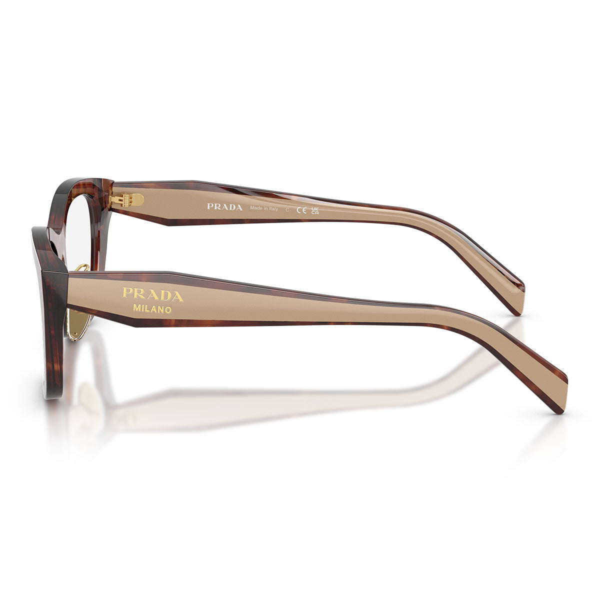 Le aste bi-tonali rappresentano l’elemento distintivo del modello: realizzate con la tecnica avanzata Brandson, fondono strati di acetato ad alta pressione per creare un raffinato effetto cromatico a contrasto. Le linee geometriche e il logo Prada Milano completano il design con un tocco di eleganza contemporanea.