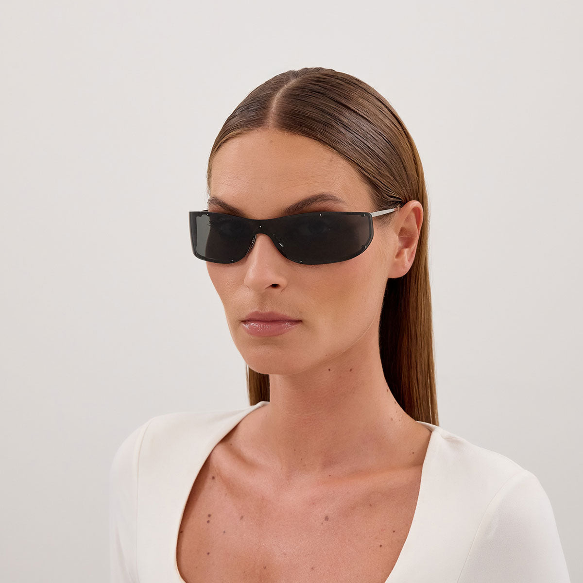 Il design è quello di una maschera con forma rettangolare stretta e morbida, capace di avvolgere il volto con eleganza e carattere. Le linee pulite ma scolpite rendono il modello immediatamente riconoscibile, perfetto per interpretare un’estetica fashion-forward e contemporanea, tipica dell’universo Saint Laurent.