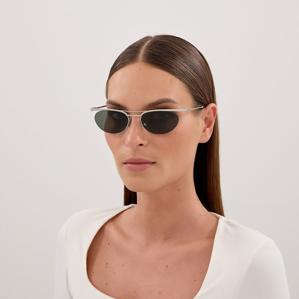 La struttura unisex è completata da lenti ovali, equilibrate e moderne, abbinate a un raffinato doppio ponte che aggiunge carattere, personalità e un richiamo heritage rivisitato in chiave attuale. Il risultato è un modello dal look deciso ma pulito, perfetto per chi ama uno stile minimal, ma con un forte contenuto fashion.