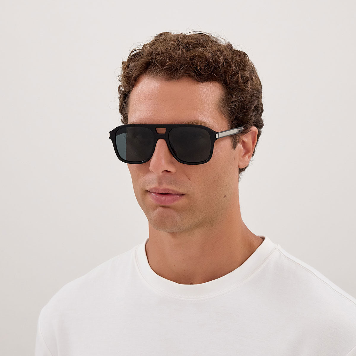 La montatura pilot unisex con doppio ponte richiama un classico intramontabile, rivisitato in chiave contemporanea. Protagonista del design è l’anima in metallo a forma di freccia, con logo Saint Laurent inciso, chiaramente visibile attraverso la struttura in resina da colata con finitura super lucida: un dettaglio di grande prestigio che rende l’occhiale immediatamente riconoscibile.