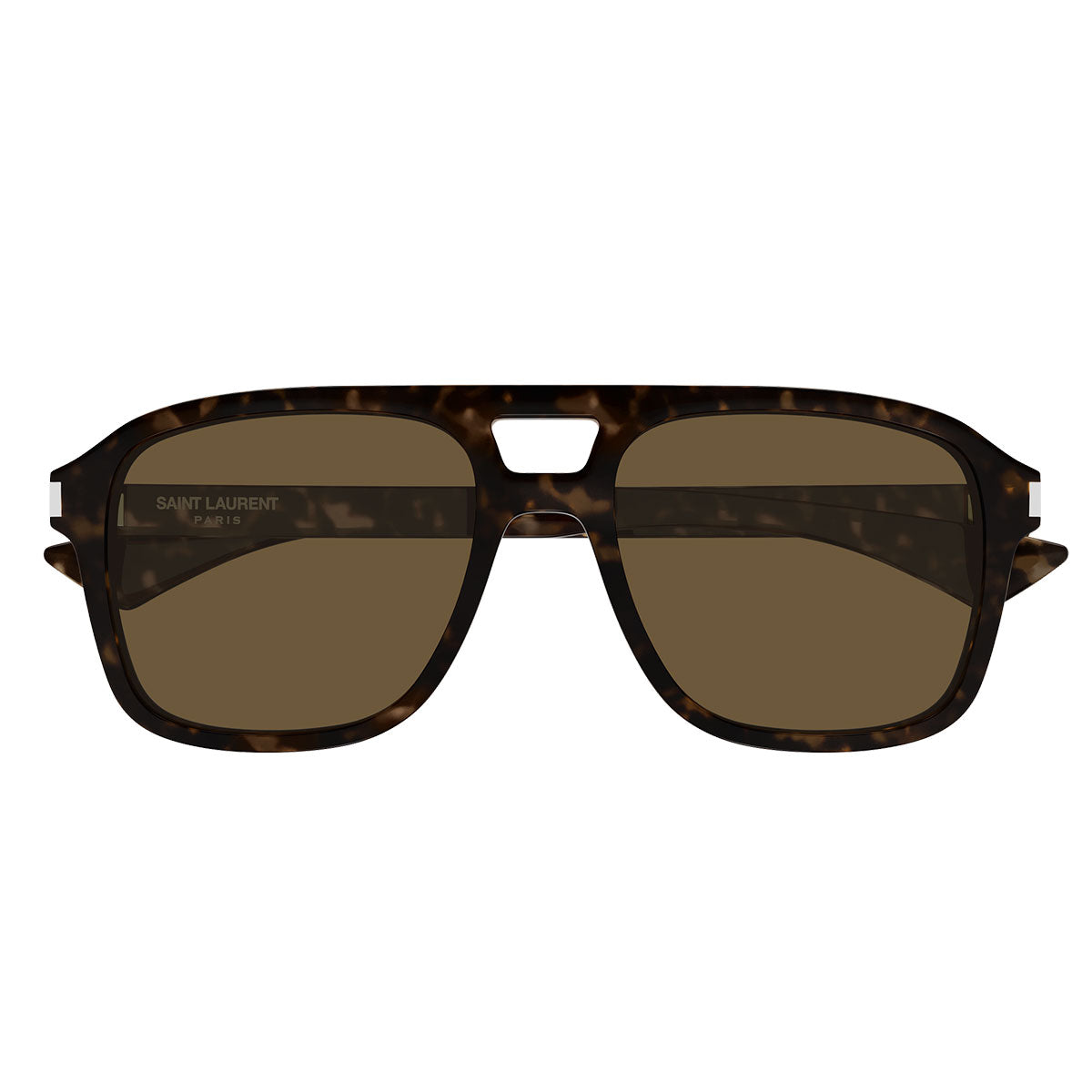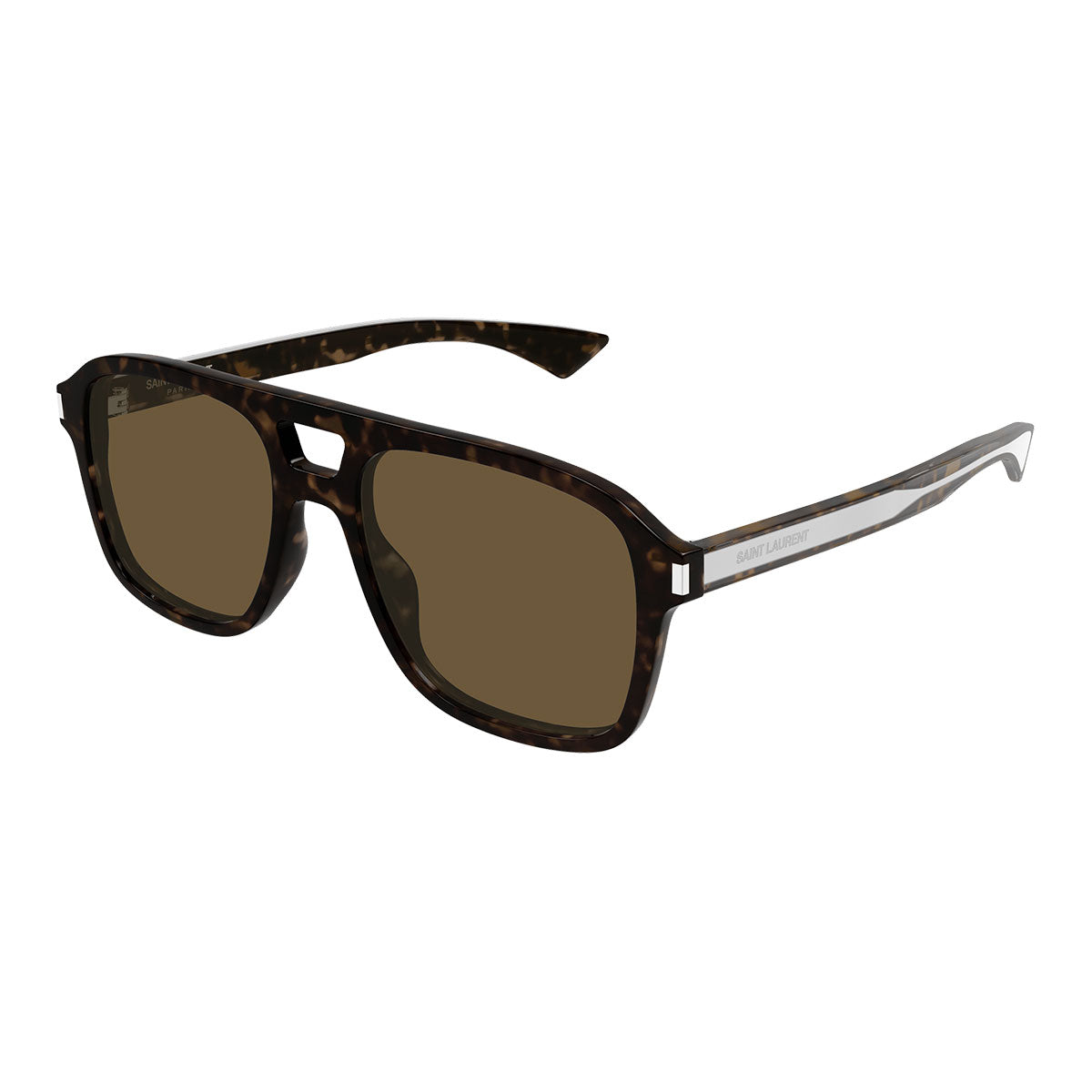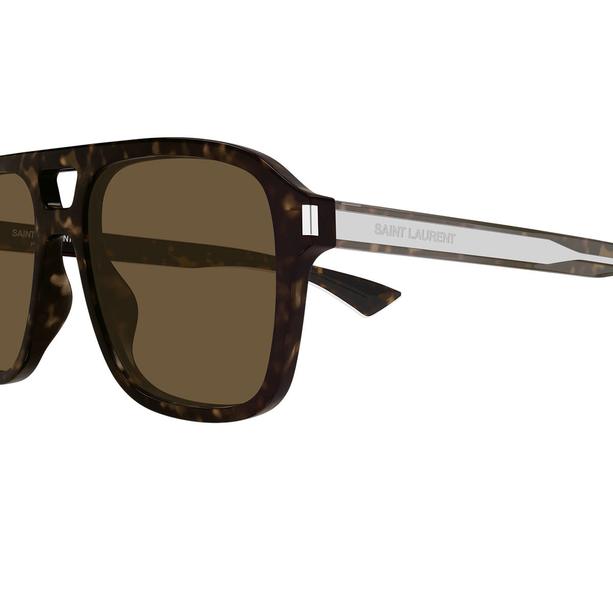 La montatura pilot unisex con doppio ponte richiama un classico intramontabile, rivisitato in chiave contemporanea. Protagonista del design è l’anima in metallo a forma di freccia, con logo Saint Laurent inciso, chiaramente visibile attraverso la struttura in resina da colata con finitura super lucida: un dettaglio di grande prestigio che rende l’occhiale immediatamente riconoscibile.