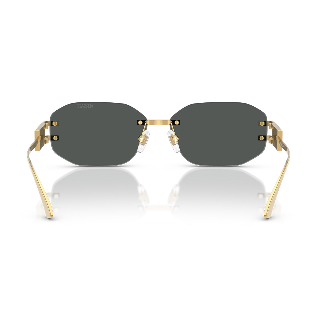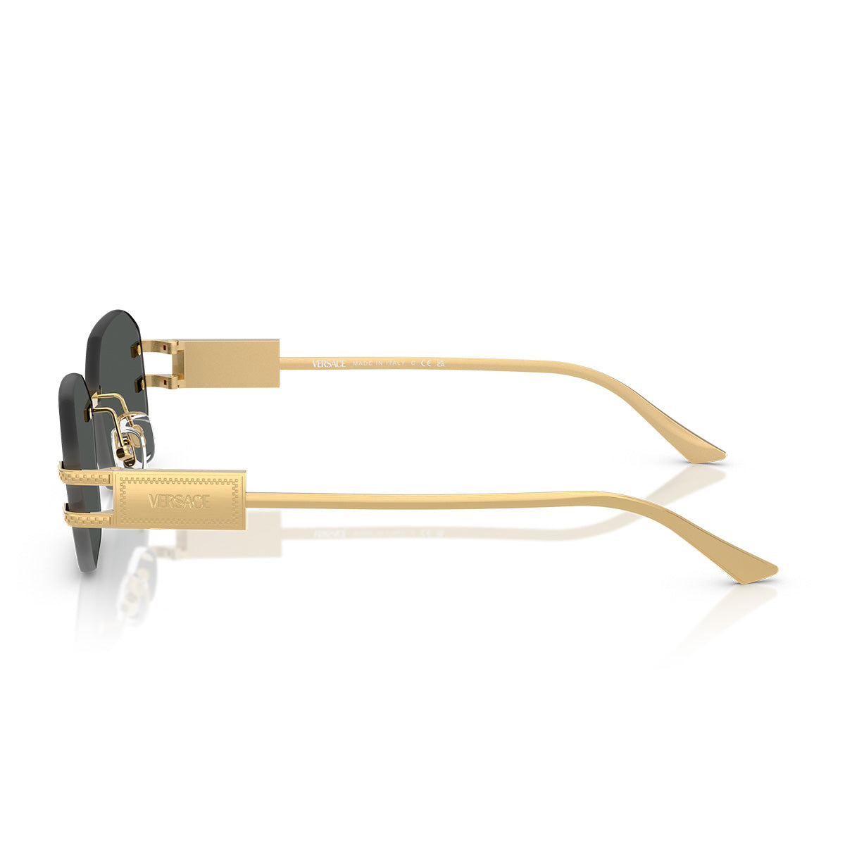 Questo modello rimless rettangolare con lenti da 3.2 mm unisce leggerezza e stile grazie alla struttura interamente in metallo, arricchita da aste avvolgenti e da una placca con logo Versace che dona un tocco distintivo e raffinato. Il logo inciso al laser nell’angolo superiore sinistro della lente aggiunge un dettaglio sottile ma riconoscibile.
